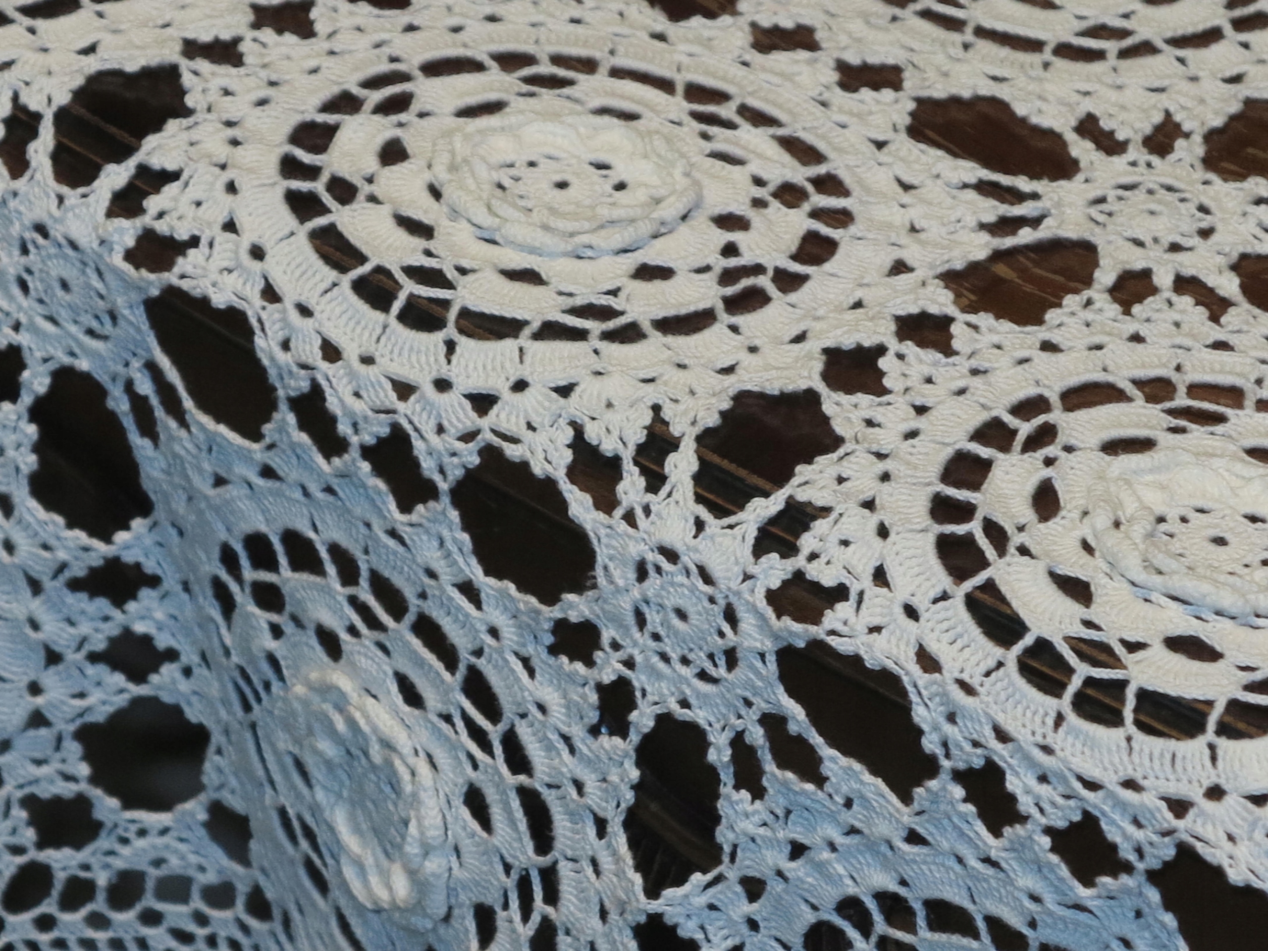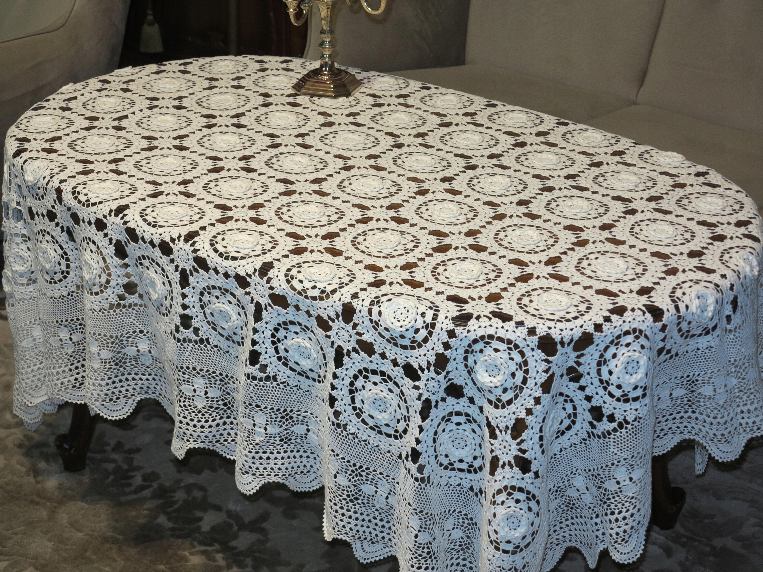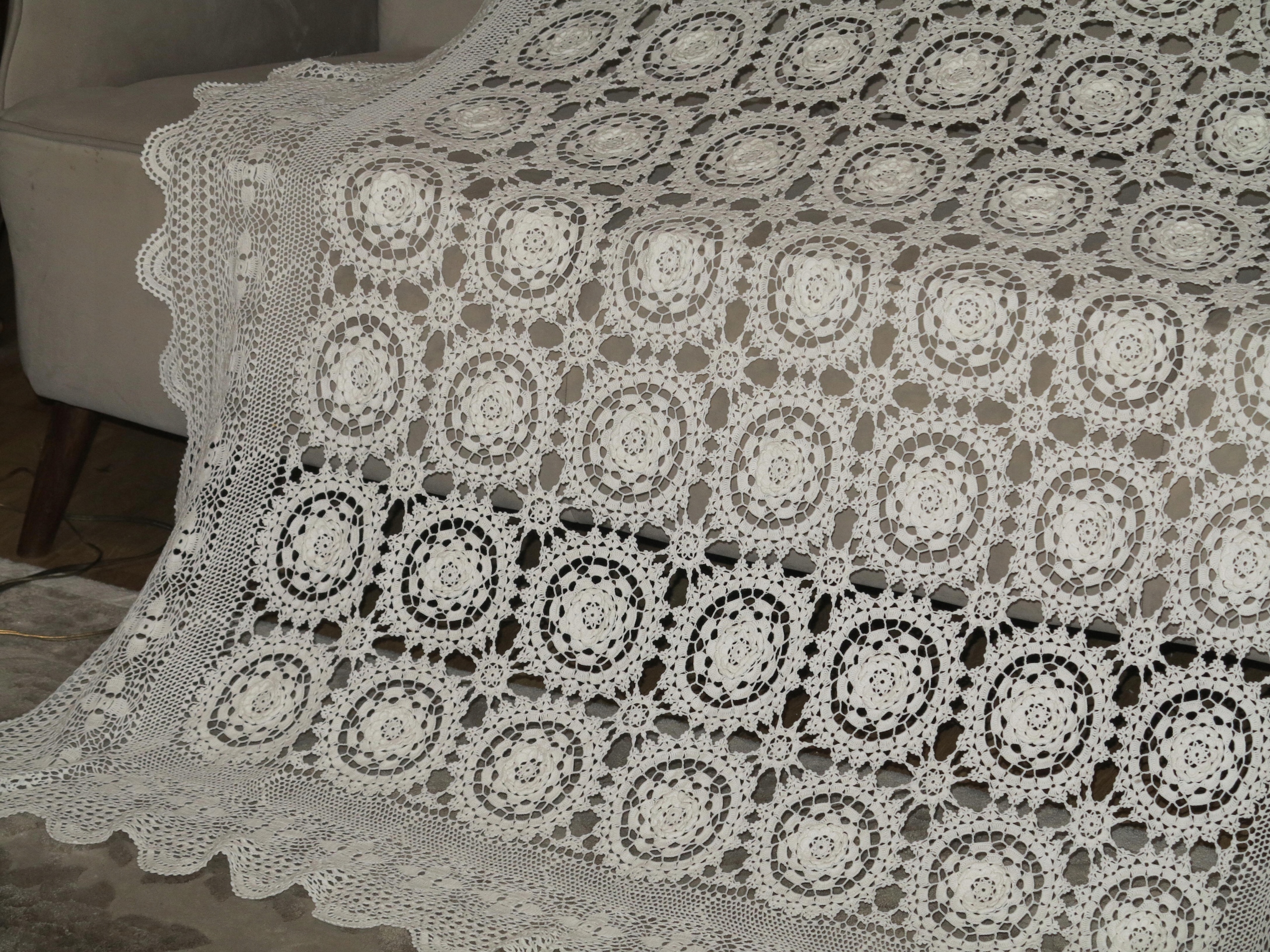 ЕКЗЕМПЛЯР - НАДЗВИЧАЙНО КРАСИВУ СКАТЕРТИНУ З БІЛОГО КОРДОНУ, ПОВНІСТЮ РУЧНОЇ РОБОТИ, ВИЗНАЧЕННЯ З БАВОВНЯНИХ НИТОК НА ТОНКОМУ В'ЯЗАННІ. ВЗІЗУНОК З ВЕЛИКИХ РОЗЕТОК ТА ОПУКЛИХ КВІТІВ.