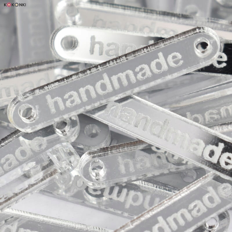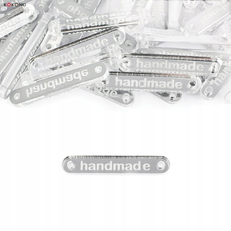 Бирка з написом "Handmade". Він має два отвори з боків, які служать для шиття.