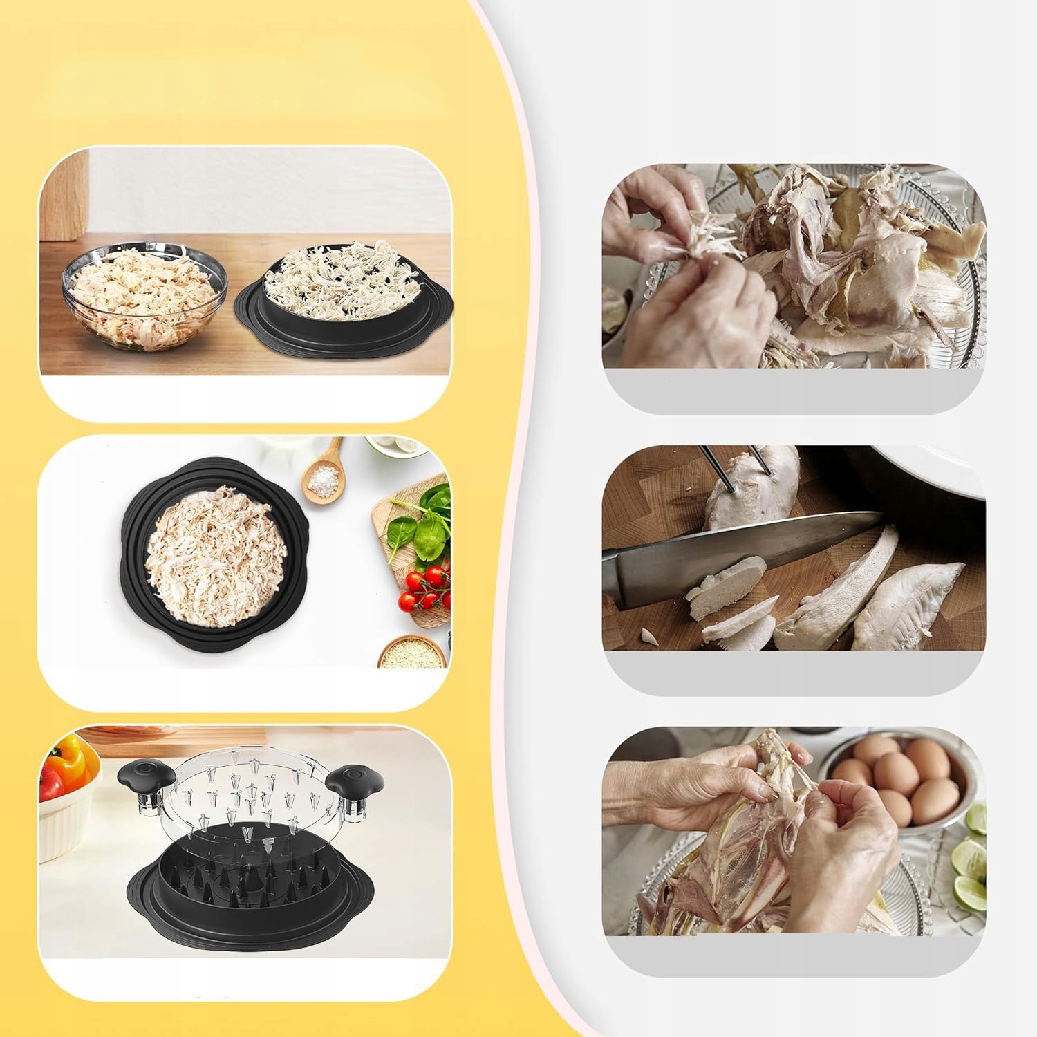 - 🥚Чудово підходить для нарізання м’яса та приготування гамбургерів, тако, курячого салату, салату з тунця тощо. Він також чудово підходить для приготування корму для домашніх тварин (примітка: готуйте курячі грудки, свинину, яловичину та інше м’ясо до м’якості перед подрібненням).
