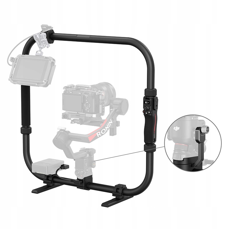Різні варіанти кріплення включають отвори 1/4"-20 і 3/8"-16, а також два порти D-Tap для універсального розширення аксесуарів. Крім того, поворотна базова ніжка забезпечує стабільне положення під час перерв у записі. Ергономічна ручка з правого боку, виготовлена з легкого вуглецевого волокна, підвищує комфорт під час тривалого використання та доповнює естетику дизайну DJI.