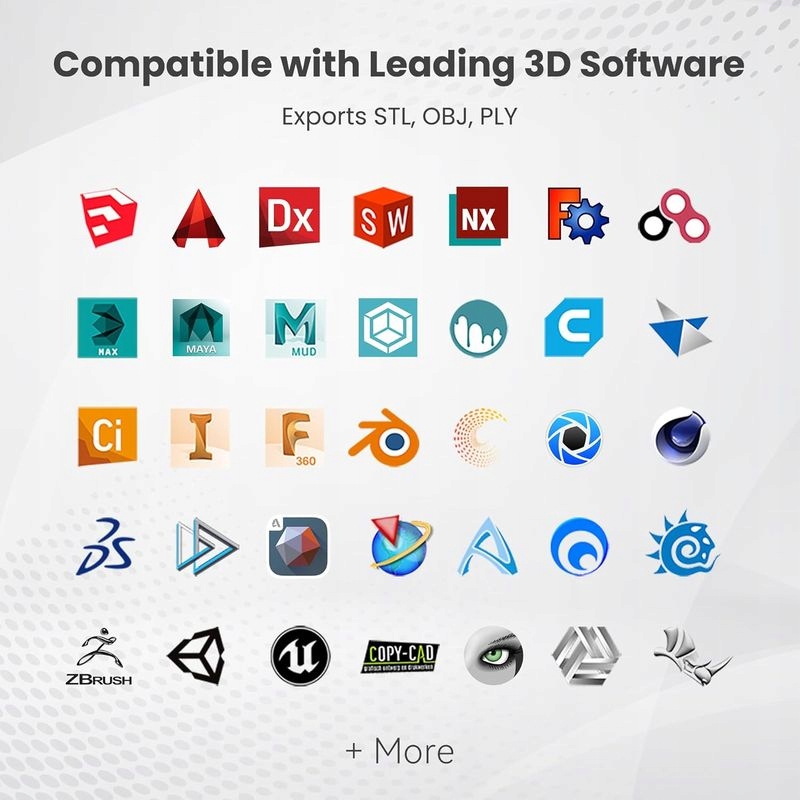 Завдяки світлу та компактній конструкції вагою всього 253 грам, 3D -сканер можна взяти з вами всюди. Wi -Fi бездротова підключення 6 корисно для мобільного сканування в той час як USB-дротове з'єднання підключення та гри корисне для миттєве з'єднання з комп'ютером . Завдяки заявці Revo Scan 5 Ви завжди будете добре готові до сканування. Програмне забезпечення Він сумісний з пристроями з iOS, Android, Windows і macos . Ви можете експортувати свої моделі у форматах, табличках або табличках або Преподобний співпрацювати з більшістю програм CAD, 3D -моделювання і 3D -друк. Можливі програми цього сканера включають ** модифікації промислове, репліка створення, оцифрування стародавніх артефактів, VR/AR або дизайн текстилю .