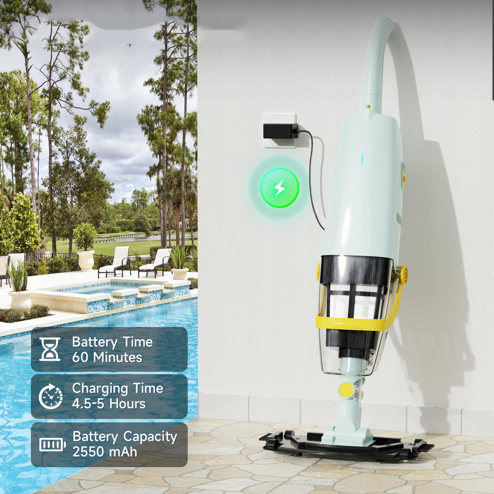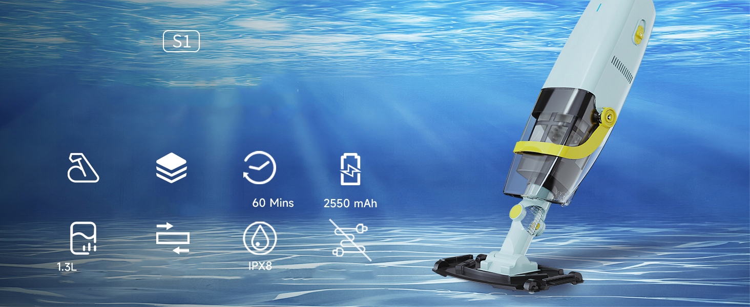 - ✅【Довговічний і безпечний】: Цей електричний очищувач басейну оснащено літій-іонним акумулятором ємністю 2500 мАг, який забезпечує понад 60 хвилин роботи, достатньо для гнучкого глибокого очищення всього басейну, а повна зарядка займає менше 5 годин. Щоб світловий індикатор працював правильно, його необхідно занурити у воду; інакше він припинить роботу через 60 секунд. Це запобігає роботі двигуна на холостому ходу та розрядженню акумулятора.