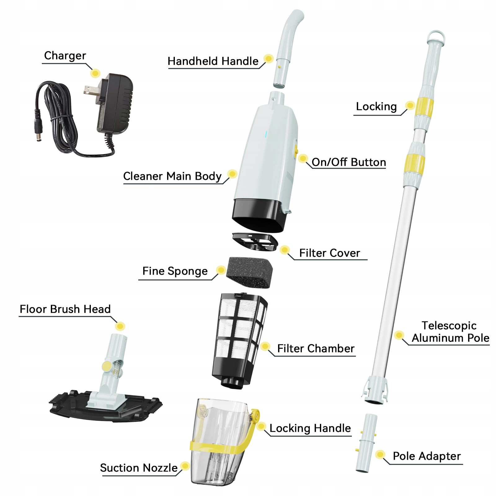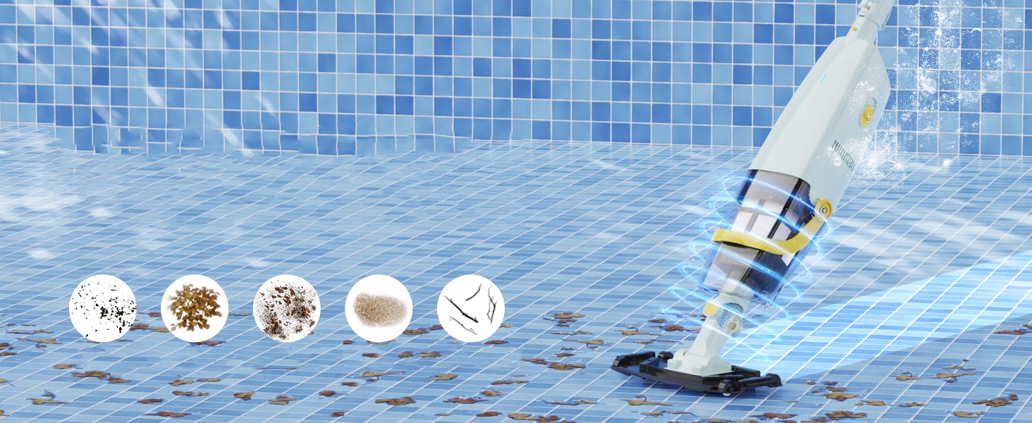 - ✅【Простота використання】: Керування однією кнопкою. Просто підключіть головний блок до доданої ручки, увімкніть живлення, і ви можете почати використовувати пристрій так само, як миєте підлогу. Пристрій оснащений великим контейнером для пилу об'ємом 1,3 л і нейлоновою сіткою 120 меш. Відфільтруйте та очистіть басейн одним рухом. Збірка повністю без інструментів. Насолоджуйтеся легким чищенням басейну, попрощавшись із громіздкими кабелями та шлангами.