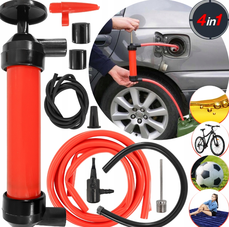 Багатофункціональний насос, виготовлений з пластику, з набором змій та кінчиків. Застосування: Накачання рідин, масел та палива, накачування кульок, матраців та понтонів.