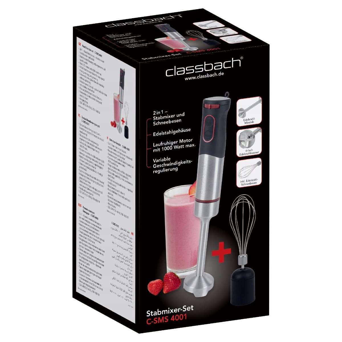 Classbach C-SMS 4001 - це блендер, який дозволяє легко готувати різноманітні страви. Завдяки своїй конструкції ручний блендер ідеально підходить для приготування соусів, крем-супів, смузі, напоїв і поживних страв для немовлят. Ви також можете використовувати його для подрібнення м’яких фруктів і овочів, а також пасти, трав, м’яса, горіхів, сиру, зварених круто яєць і цибулі. Додатково в комплект входить віночок для змішування інгредієнтів. Завдяки потужному двигуну з максимальною потужністю 1000 Вт і зручному повзунку ви можете контролювати їх приготування. Пристрій має глибоку кришку з чотирьох лез для запобігання розбризкуванню та протиковзку ручку, що забезпечує безпеку та комфорт використання. Знімні наконечники блендера легко чистити.