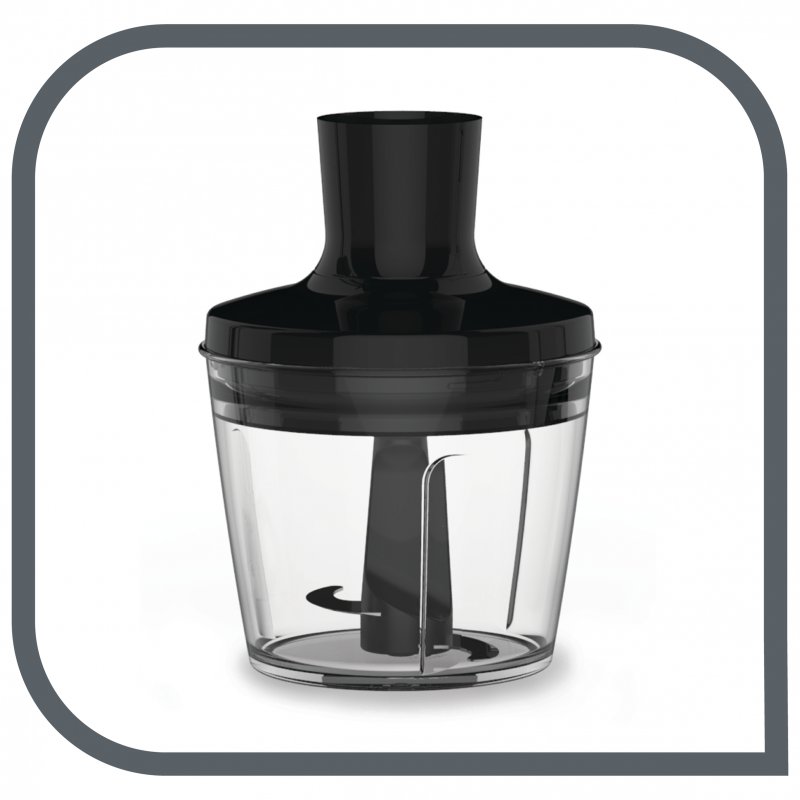 - Це пристрій 2-в-1 – занурювальний блендер і міні-подрібнювач на 500 мл, який дозволяє подрібнювати трави, горіхи та овочі.