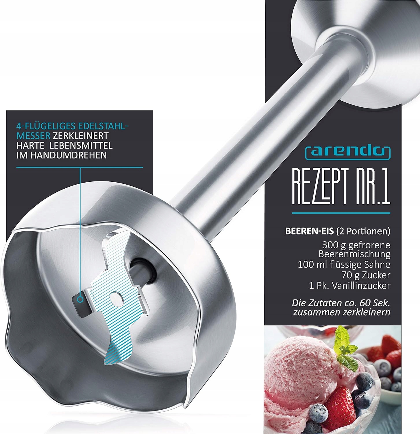 - Attached components: Arendo - 1000 W Turbo Hand blender, 4 -fold stainless steel knife, user manual