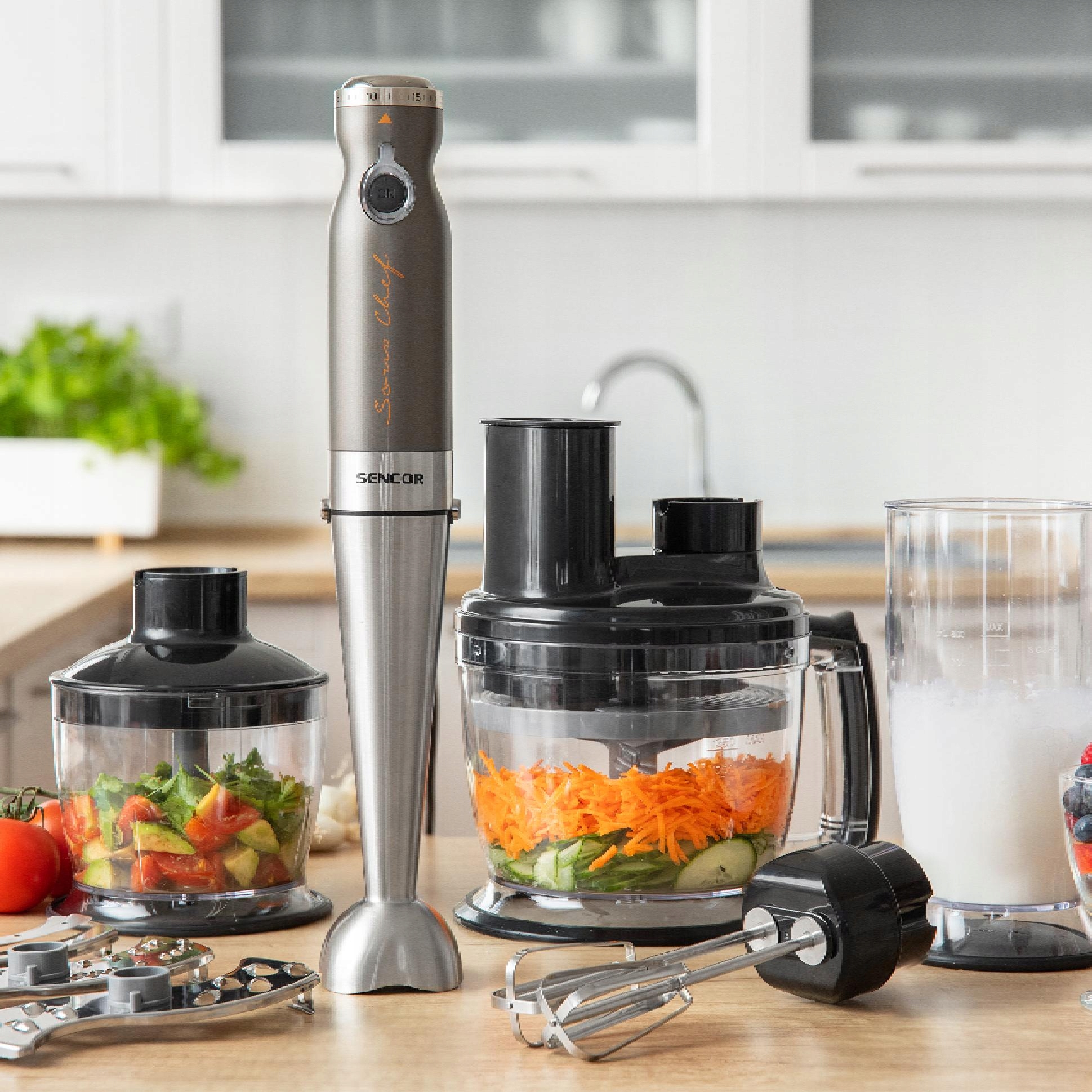 Ручний блендер 9-в-1 SHB 5501CH-EUE3 від Sencor виготовлений із міцних матеріалів. Це забезпечує тривалу та ефективну роботу блендера. Леза з нержавіючої сталі менш схильні до затуплення та корозії. Пластикові контейнери зменшують шанси, що вони розіб’ються під час падіння.