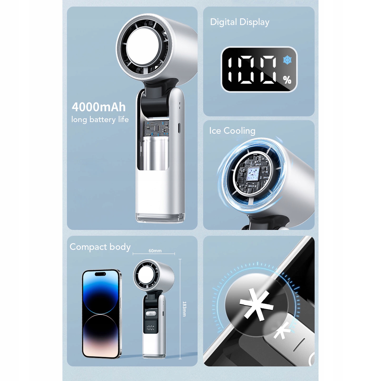 4. Акумулятор з великою ємністю: портативний вентилятор руки оснащений акумулятором великої ємності, забезпечуючи сильну міцність і робить його дуже зручним для виконання та щоденного використання.