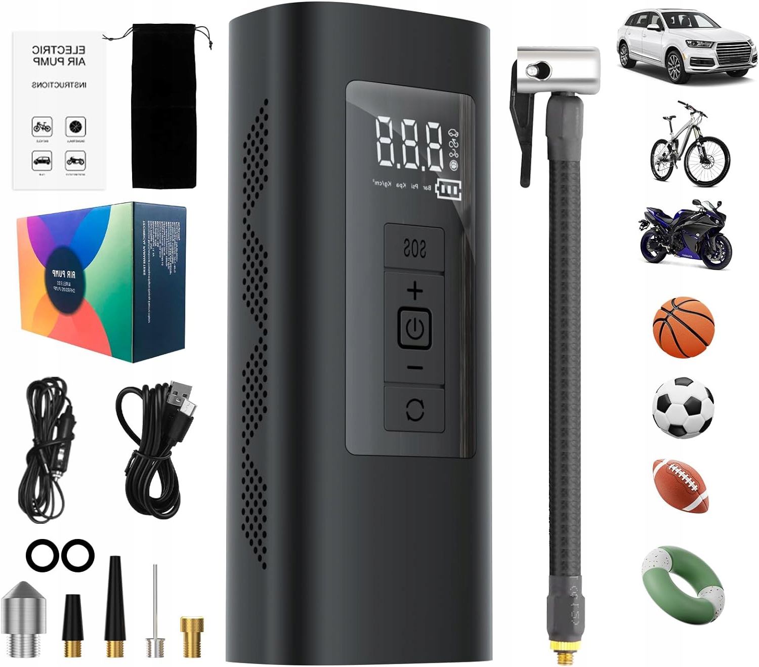 - 🔋 Ефективний міні-накачувач для шин із максимальним тиском 150 PSIпортативний повітряний компресор має лише 17 x 7 x 5,5 см і важить лише 608 грамів. Вбудована батарея ємністю 3x1800 мАг, яку можна зручно та швидко заряджати за допомогою штекера Type C та кабелю для зарядки автомобіля. За допомогою цього компресора ви можете легко накачати всі маленькі автомобілі (лише маленькі автомобілі), шини для велосипедів і мотоциклів, плавальні кільця, надувні іграшки та інші надувні вироби всього за кілька хвилин.