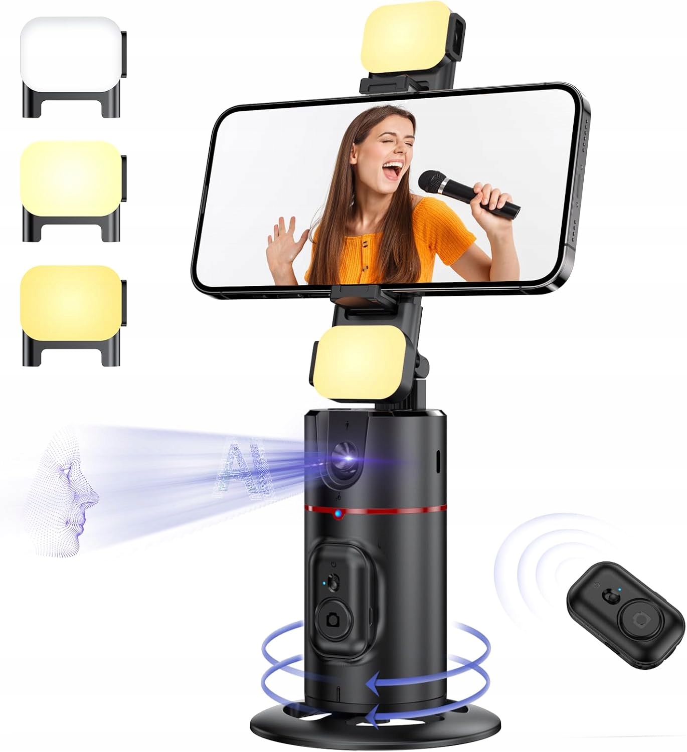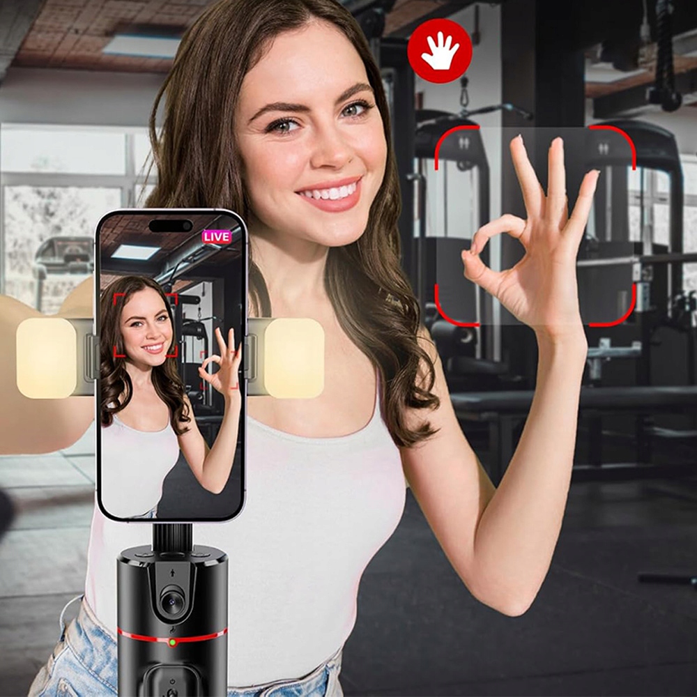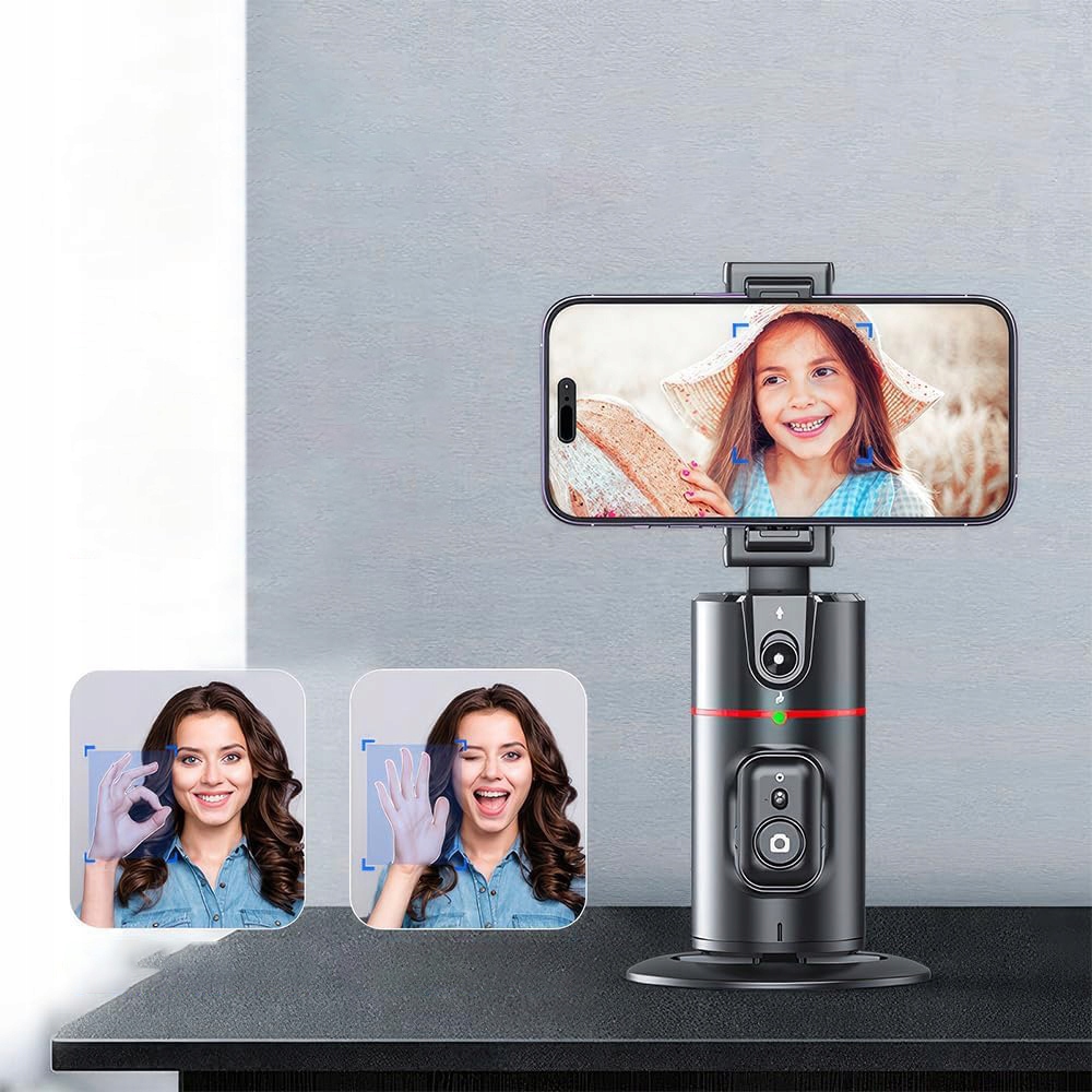 el disseño factiodado del sestra informático de ia altamente sensible sigue y gira automoticemante en función del movimemo de la cara y Куерпо. El soporte para telefono tiktok 360 ° gira constantemente con tu movimiento.