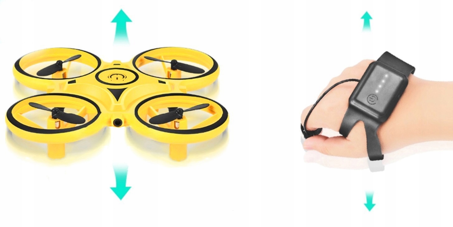 - КЕРУВАННЯ ЖЕСТАМИ – в комплект входить гравітаційний браслет, що дозволяє зручно керувати тільки з його допомогою! Забезпечує безпечний зліт і посадку в польоті. Керуючи дроном рукою, ви маєте широкий спектр можливостей маневрування, достатньо легкого руху руки, щоб змінити напрямок польоту. Ви надягаєте ремінець на руку, просунувши його між великим пальцем і помістивши ремінець із кнопкою на вказівний палець. Поруч на голову має 12-ступеневе регулювання ширини.