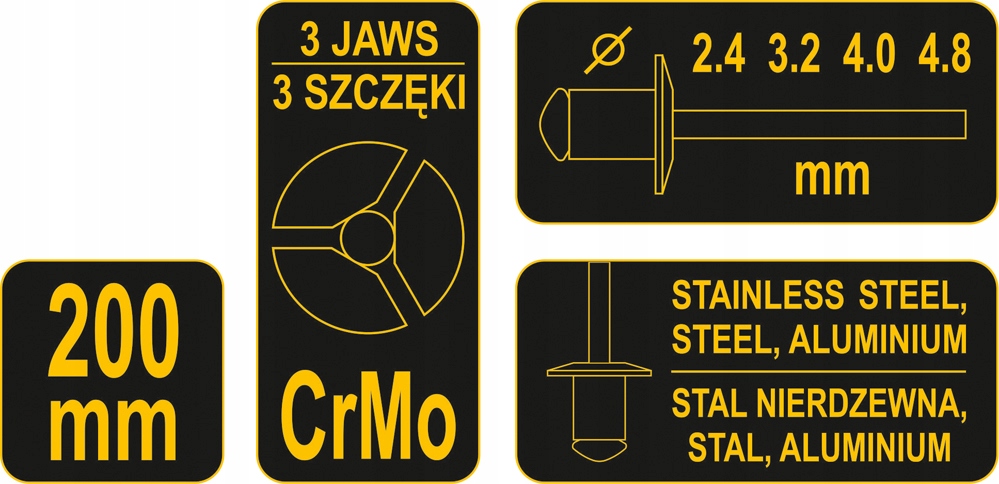 - Діаметр заклепки [мм]: 2,4; 3.2; 4,0; 4.8