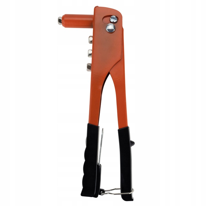 Заклепувальна машина загальною довжиною 24 см виготовлена з високоякісної сталі. Ручка покрита протиковзкою гумою і оснащена фіксатором проти відкриття. Завдяки змінним наконечникам дозволяє з'єднувати елементи заклепками 4-х діаметрів: 2,4 мм, 3,2 мм, 4 мм, 4,8 мм. Крім того, ручка містить шестигранний ключ для відкручування та загвинчування кінців.