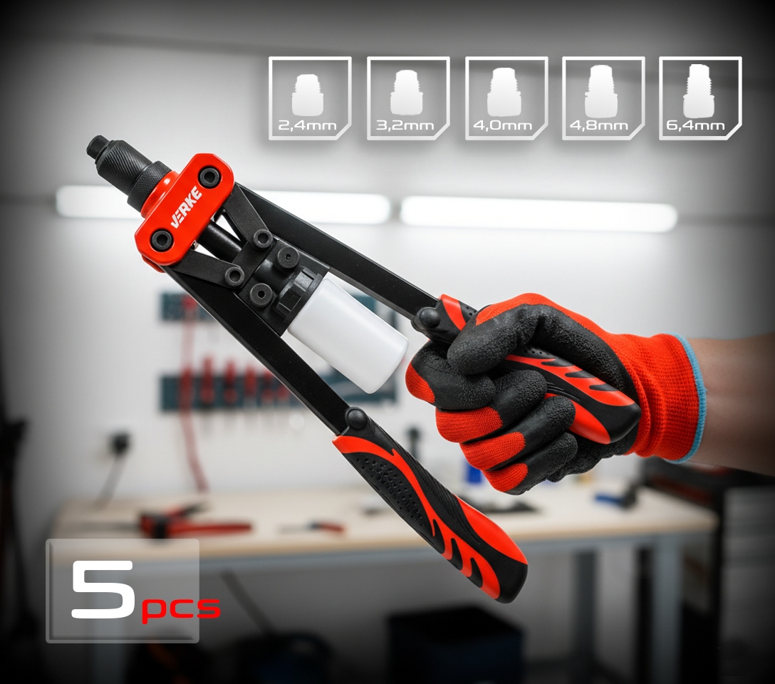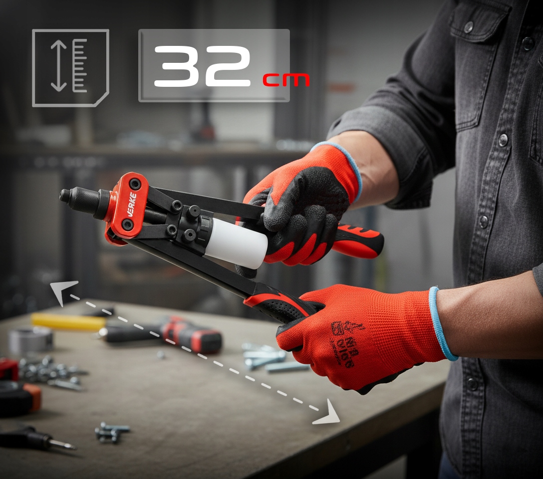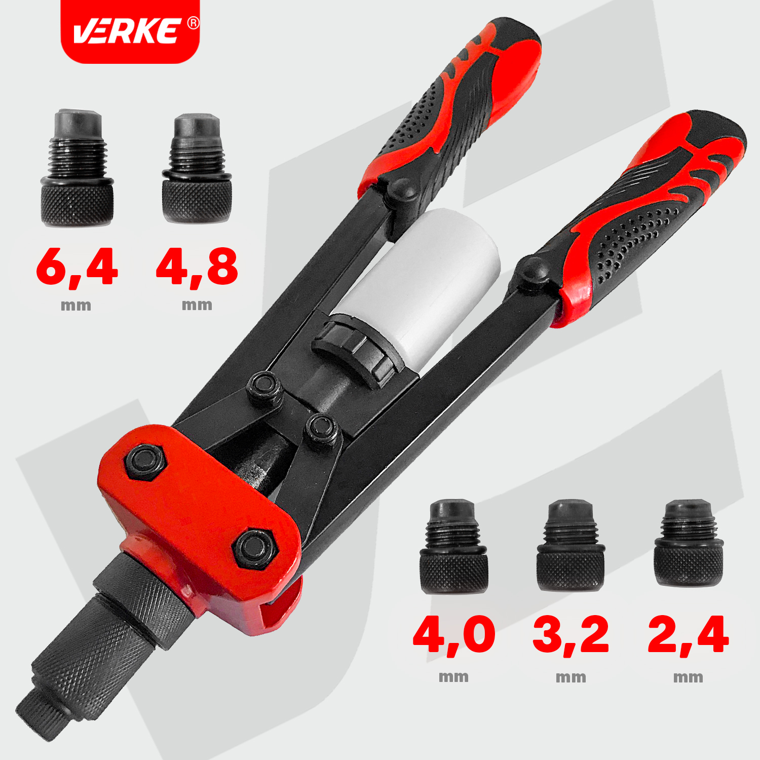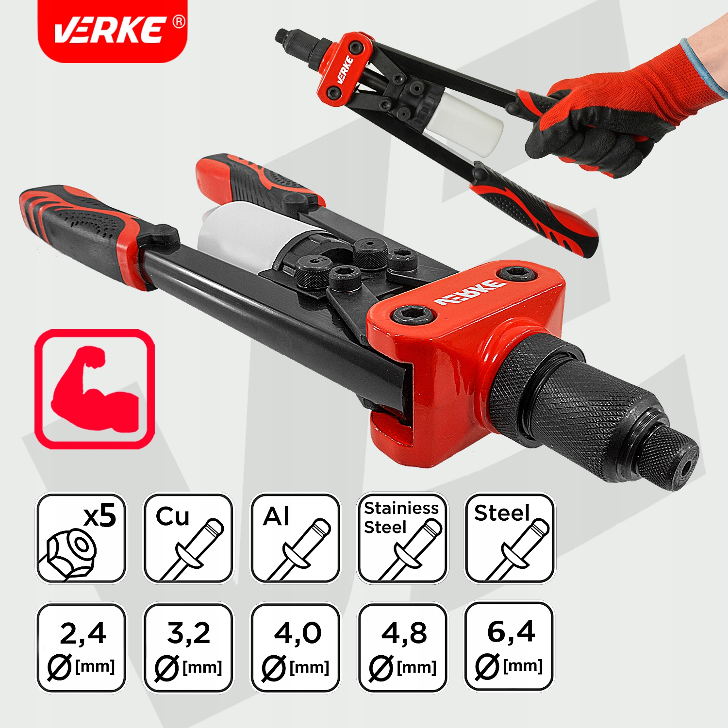 - Висока якість: Заклепувальник VERKE виготовлений із міцних матеріалів, що гарантує його надійність і довговічність.