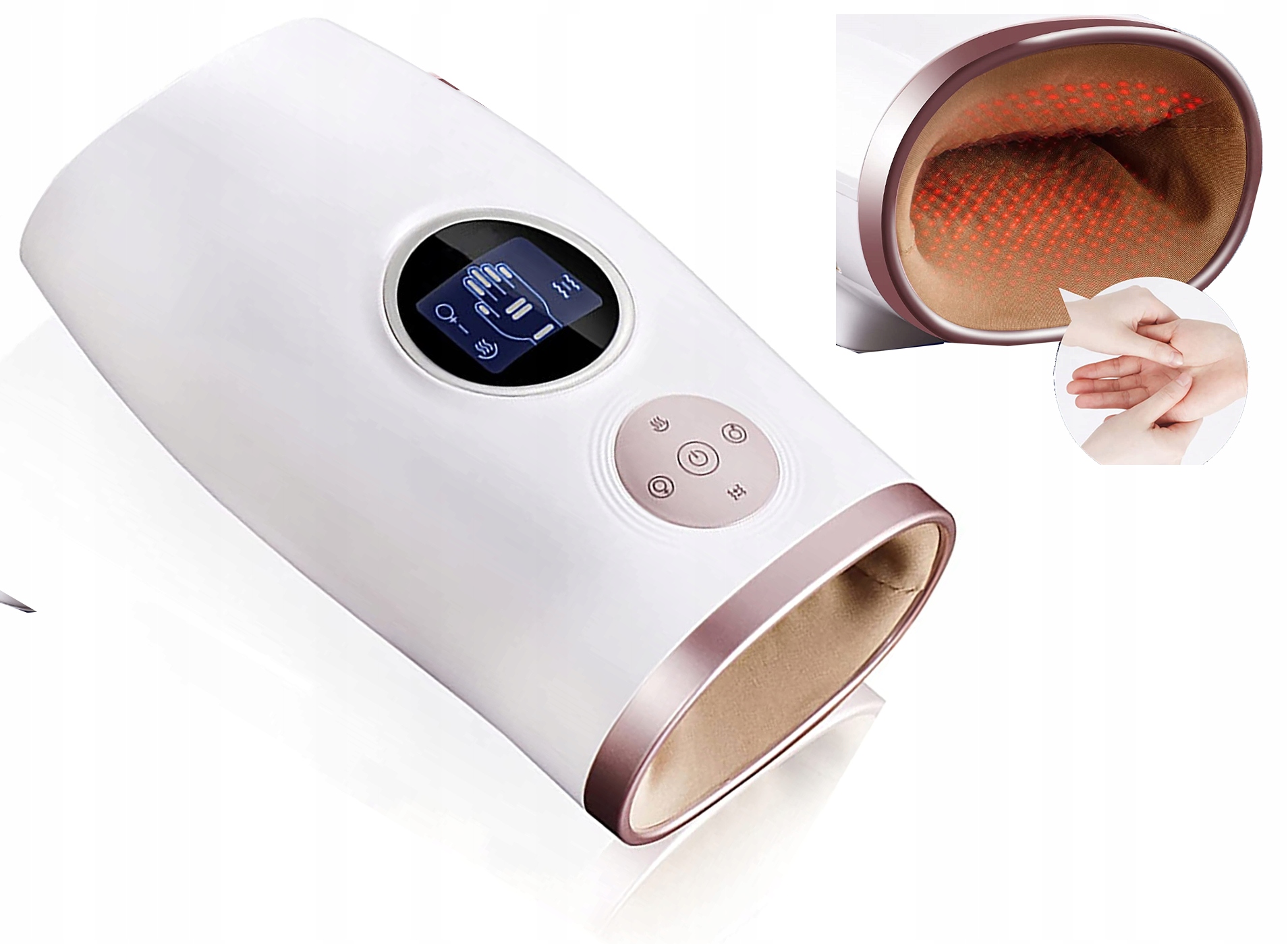 - Масажер використовує компресійний масаж за допомогою гарячих компресів, щоб розслабити кожну частину руки та опрацювати пальці та суглоби пальців, забезпечуючи глибоке розслаблення. Теплий масаж рук покращує кровообіг, заспокоює м’язи, зменшує втому рук, дискомфорт, біль, оніміння та холод у пальцях і кисті