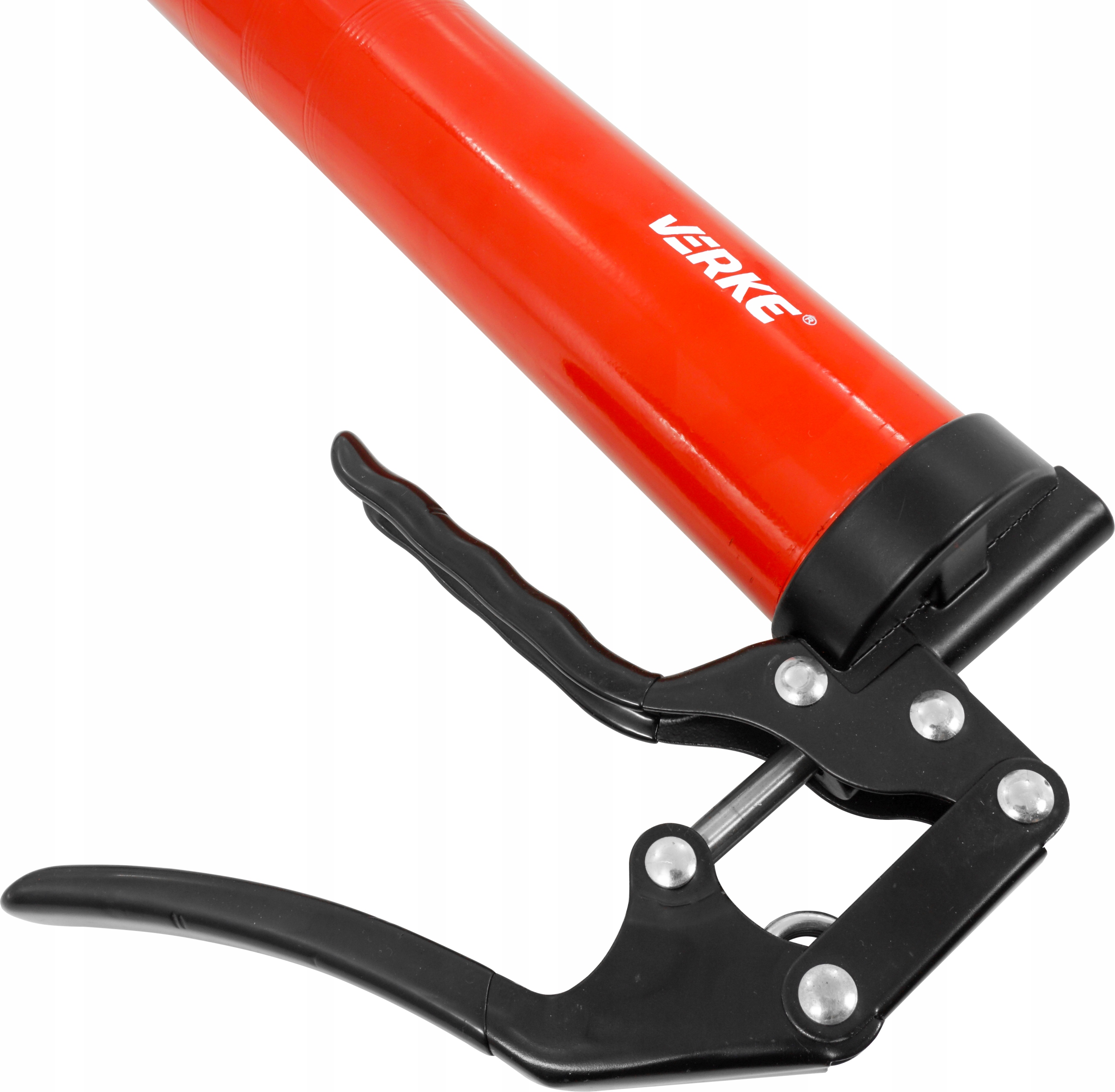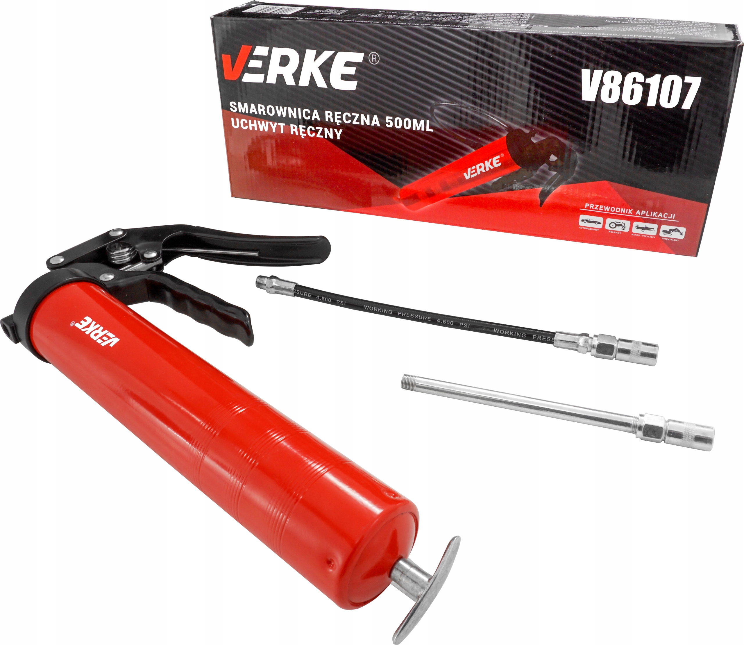 Мастильний пістолет бренду VERKE – це пристрій, який використовується для змащування під тиском механічних елементів, таких як вали, штифти, підшипники, з’єднання. Він виготовлений із сталевого циліндра ємністю 500 мл, в якому працює поршень з ручним приводом. Поршень виготовлений з високоякісної гуми, стійкої до тривалого впливу мастила та масла. Набір містить дві жорсткі та гнучкі наконечники, які підходять до стандартних наконечників Calamity.