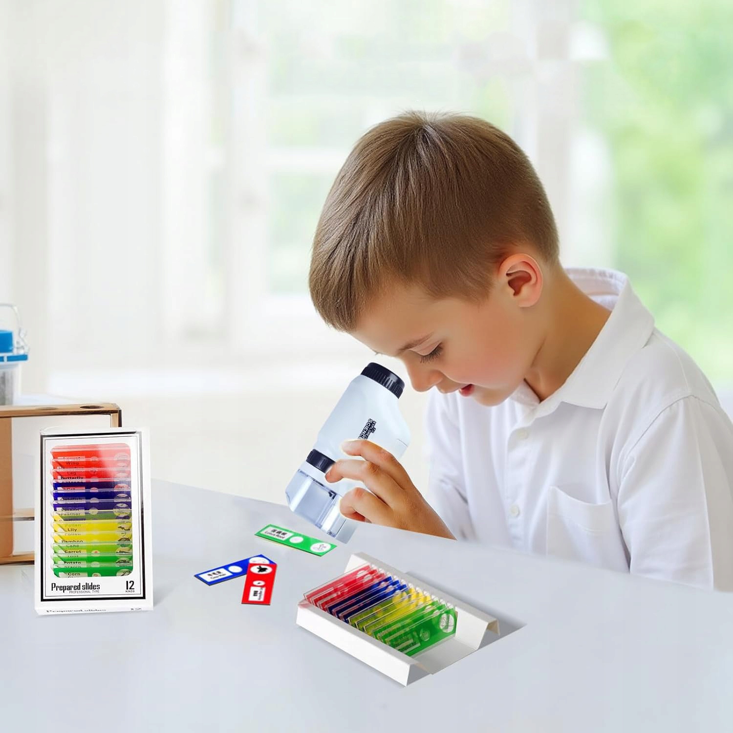 збільшується з 60 разів до 120 разів, цей компактний мікроскоп дозволяє дітям спостерігати за життям рослин і тварин із захоплюючими деталями. Набір містить 12 мікроскопічних слайдів із зразками, що забезпечує дітям широкий спектр речей для вивчення та вивчення. Легкий дизайн полегшує перенесення, завдяки якому маленький вчений може виявити мікроскопічний світ де завгодно. Ідеально підходить для пробудження цікавості та наукових відкриттів.