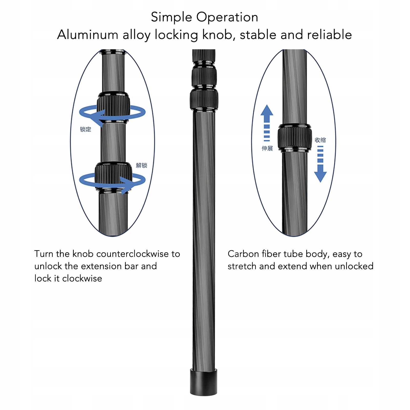 3. Труба з вуглецевого волокна: Tipe з подовжувальною трубою використовує 8-шарове вуглецеве волокно, з максимальним діаметром 22-мм труби, має високу міцність і легкість, придатні для зовнішньої фотографії.