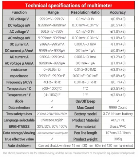 - Автоматичний/ручнийдіапазон підрахунку 9999true-RMSМультиметр можна використовувати для вимірювання-AC/DC-напруги та струму, опору, ємності , частоти, температури, безперервності та перевірки діодів .