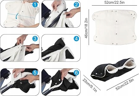 4 Волосся м’яке, тепле і не пригнічується. Після використання прихованої кнопки вона щільна і ефективно блокує температуру. Тримайте руку теплою в холодні зимові дні. Універсальний розмір для коляски - рукавички для коляски, придатних для кожної коляски, доступної на ринку. Оптимальне рішення для осені та зими. Ви можете покласти руку в рукавичку і загорнути зап'ястя, щоб зап’ястя та руки були справді теплими! 4 Тканина товста і міцна, стійка до вологи та стирання. Легка збірка дитини - складіть рукавички для коляски для двох половин, затягніть ремінь коляски і запишіть усі кнопки безкоштовно: відбиваючи для коляски, гарячий полив