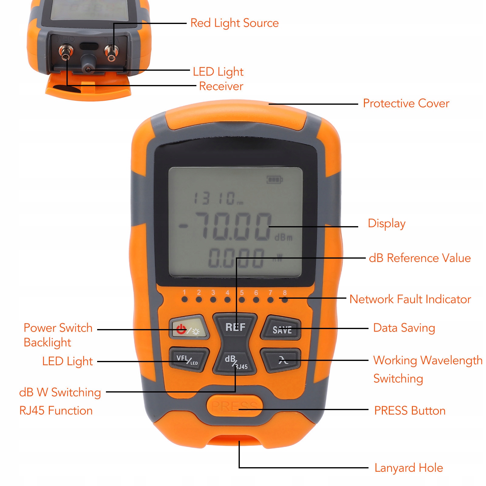 5. Кілька функцій: інтегрований тест мережі, вимірювач оптичної потужності, джерело червоного світла та світлодіодне освітлення, що покриває більшість ваших потреб у обслуговуванні зв’язку.