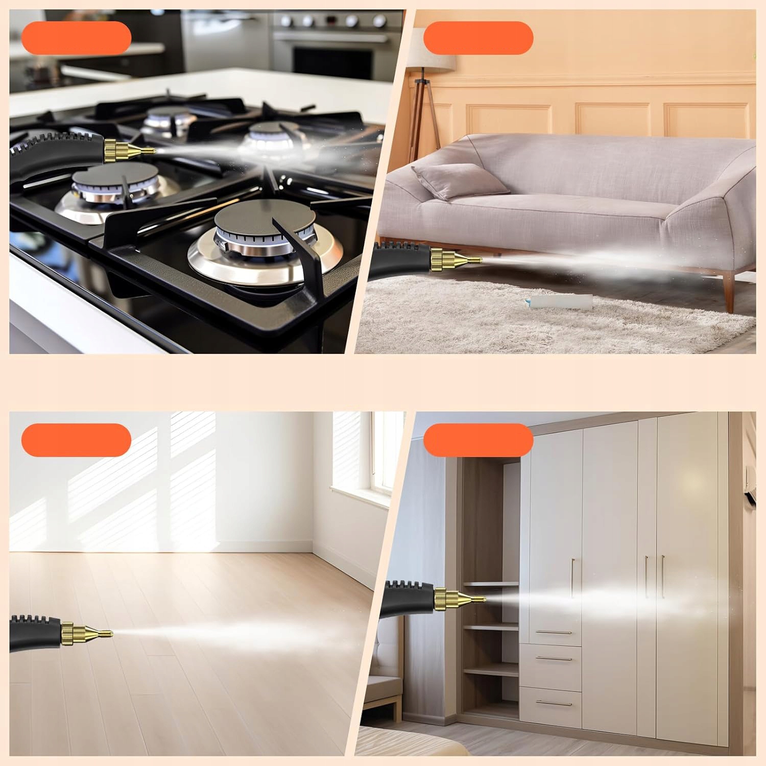 Ця парова машина добре працює при очищенні та прасуванні. Три типи пензлів, такі як: невелика кругла нейлонова щітка, велика кругла нейлонова щітка та невелика сталева щітка. Він є універсальним і може очистити все, що важко досягає прогалин, кутів, кутів та всіляких поверхонь/матеріалів: кухонні мийки, стільниці, грилі, туалети, підлоги, дитячі іграшки, матраци тварин, машини, дивани та одяг.