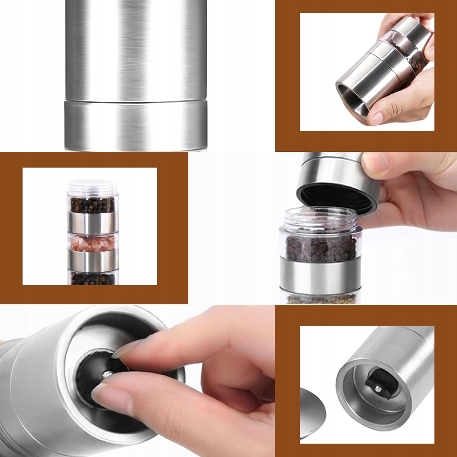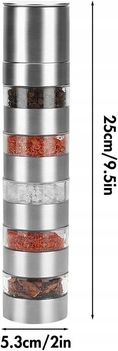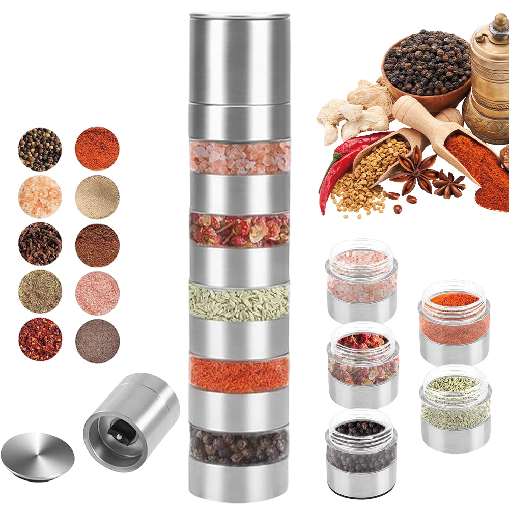 5 -в 1 міні -наборі соляного шейкера виготовлений з нержавіючої сталі, вона дуже міцна і міцна і не іржавіє. Прозорий корпус ABS. Спочатку протестуйте, щоб отримати потрібний аромат.