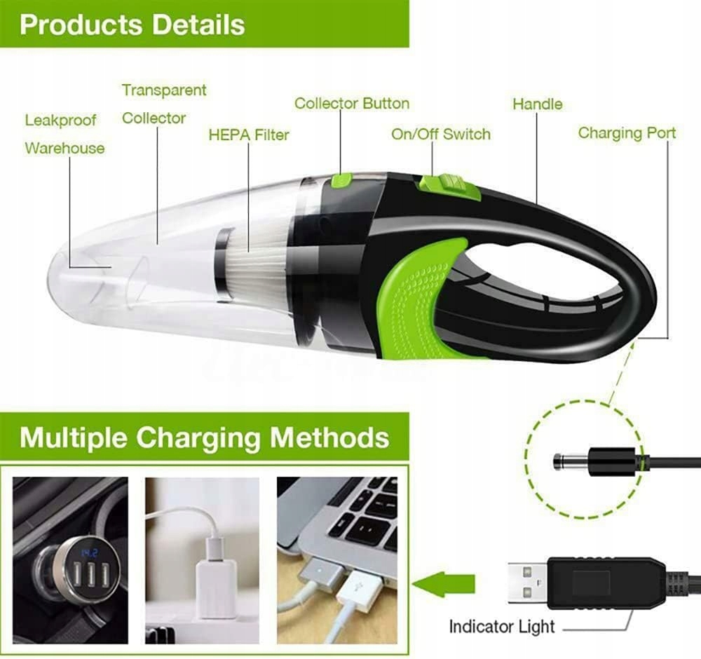 Сильна потужність всмоктування та висока ефективність. Ручний пилосос має вбудовану циклонну технологію, яка може забезпечити безперервну потужність всмоктування 5000 Па. Ефективно очищає не тільки пил, клаптики паперу, волосся та інші дрібні забруднення, а й дрібні камінчики та рідини. Повністю заряджений пилосос може працювати від 20 до 25 хвилин. Ефективне та тривале використання забезпечує відмінний досвід очищення. Багатофункціональний захист від зарядки та використання Цей пилосос можна використовувати вдома та в автомобілі, завдяки бездротовій конструкції його можна використовувати будь-де та будь-коли. Оснащений літій-іонним акумулятором ємністю 2700 мАг, акумулятор високої ємності забезпечує щоденну роботу. Ручні пилососи також мають захист від перенапруги, перевантаження по струму та захист від перегріву в нашій системі заряджання для безпеки. Міцний фільтр, який легко миється. Фільтр пилососа виготовлений з нержавіючої сталі та має губку, яку можна мити та використовувати повторно. Коли контейнер для пилу заповниться, просто натисніть кнопку розблокування. Зніміть фільтр HEPA та висушіть його, перш ніж покласти його назад у пилосос. Він навіть може вловлювати шерсть домашніх тварин у тісних місцях, не забиваючись. чудово підходить для котячого безладу, наприклад поїдання шерсті. Бездротовий ручний пилосос, який широко використовується, оснащений 4 аксесуарами, включаючи щілинні насадки для вузьких щілин, кутів і рідин, насадки-щітки для килимів і волосся, а також м’яку довгу трубку для частинок пилу. Вдома, в офісі чи в машині вам завжди буде легко прибирати з нашими пилососами. Бездротовий стиль зручний і ефективний у використанні практично будь-де. Головною особливістю бездротових ручних пилососів великої місткості є зелений колір, який нагадує нам про те, що кожен із нас відповідає за захист навколишнього середовища. Підходить для всіх типів людей, особливо для жінок. Акумуляторний пилосос був розроблений, щоб звільнити ваш мобільний простір і підтримувати його в чистоті та порядку під час прибирання кухонних кутів автомобілів або сходів. Це такий чудовий подарунок.