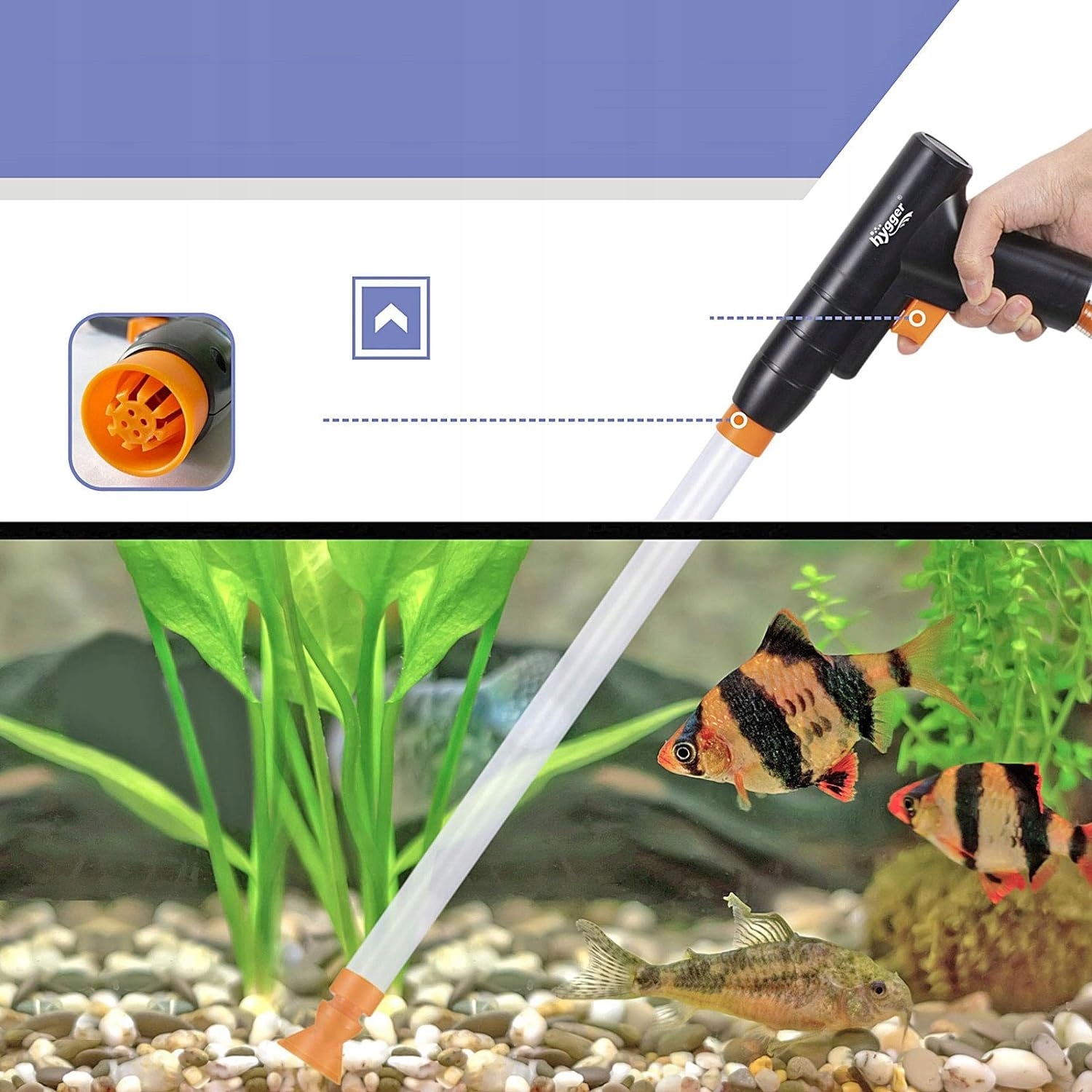 - Ручне керування пилососом дозволяє точно керувати всмоктувальною трубкою, що дозволяє ретельно очистити всі закутки та щілини в акваріумі.