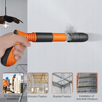4 > ✔5 Регульовані передачі: Головка пістолета використовує послідовну конструкцію регулювання переміщення, 5 регульованих передач, енергетичний ефект, звичайно, відрізняється, а сфера застосування також відрізняється. Він може бути пристосований до різних вимог до сили будівлі. Простий у використанні, потрібно лише п’ять простих кроків: 1. Покладіть захисні окуляри, рукавички та вушні пробки; 2. Виберіть нігті; 3. Встановіть пістолет для нігтів вертикально на робочому місці, готовий до використання; 4. Засупивши нігтя вертикально в стіну; 5. У випадку механізму реактивного речовини утримуйте ручку глушника і кілька разів видавлюйте її до спини, щоб скасувати шлак. Широкий діапазон застосувань: бетон характеризується високою потужністю проникнення. Він може пробити сталеву пластину товщиною 3 мм за один крок лише за 0,1 секунди. Цей NAID підходить для нігтів завдовжки 25 мм. Німецька машина підходить для монтажних камер, електричних банок, водних та електричних установ, кондиціонерів, підвісних фотографій, багатофункціональних полиць, невеликих банок для з'єднання, складання труби, зв'язування кабелю тощо ✔ глушник: Кришка глушника потовщується для зменшення шуму. Просто натисніть і відпустіть, і дія займе лише секунду, а кришку можна легко прибити без використання електроенергії. Зробіть навколишнє середовище будівлі більш комфортним, не заважаючи миру жителів.