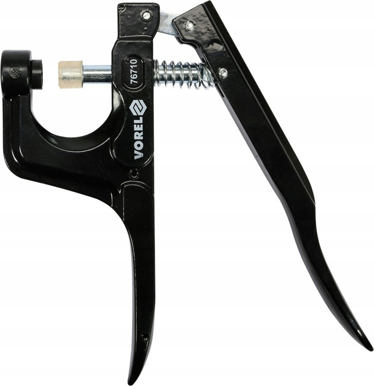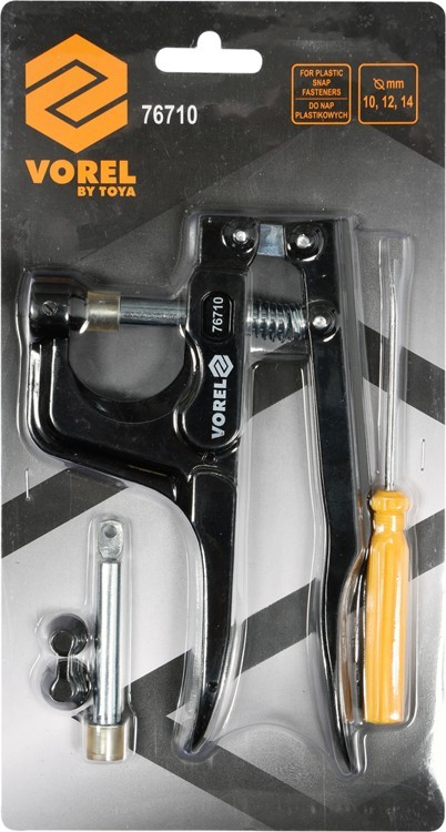 Ручний прес для встановлення пластикових застібок. Корпус виготовлений з алюмінію, притискний елемент - сталевий штифт. Матриці у вигляді напівкруглих застібок виготовляються зі спеціального матеріалу. У комплект входить додатковий штифт і набір плашок для засувок з найбільш поширеними діаметрами 10, 12 і 14 мм.