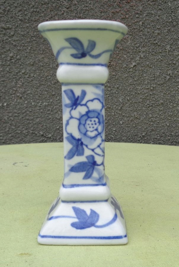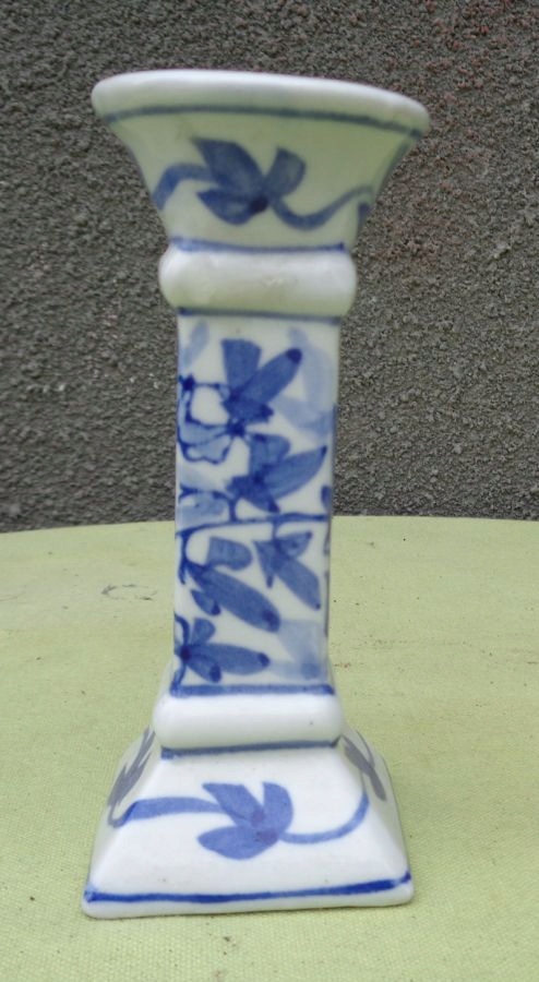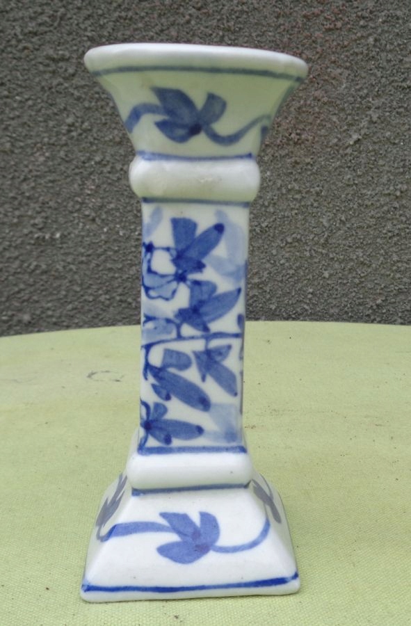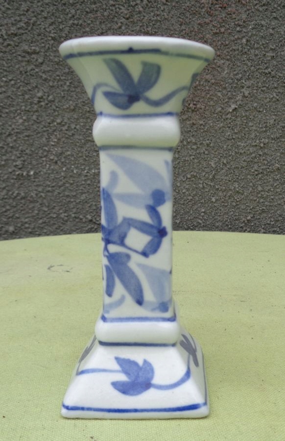 Цікавий, цікавий, розписаний вручну порцеляновий свічник 1880-1900 років. Експонат має квадратну основу, яка плавно піднімається вгору. Основа прикрашена натуралістичними орнаментами, розписаними вручну кобальтом. Центральна частина також розписана вручну кобальтом з натуралістичним орнаментом. Зверху та знизу центральна частина оброблена витонченими опуклостями. Верхівка підсвічника чашоподібної форми, також вручну прикрашена розписом. Високоякісна порцеляна кольору слонової кістки. Експонат неушкоджений. Рекомендую всім.