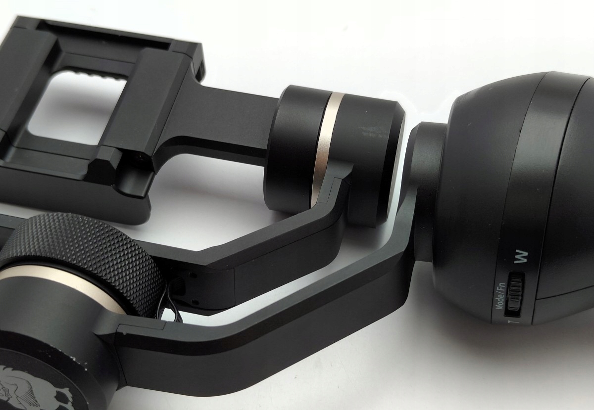 Перемикання між режимами роботи інтуїтивно зрозуміле. Це робиться за допомогою функціонального перемикача, розташованого на ручці підвісу під вказівним пальцем. Перемикач також використовується для переведення підвісу в режим сну/пробудження та керування масштабуванням під час використання спеціальної програми. Обраний режим роботи і рівень заряду батареї відображаються двома світлодіодними індикаторами, розташованими з боків у верхній частині ручки. Підвіс також має джойстик і функціональну кнопку, розташовану на ручці під великим пальцем. За допомогою функціональної кнопки ми можемо вмикати/вимикати підвіс, а також запускати фотографії та починати/зупиняти запис.