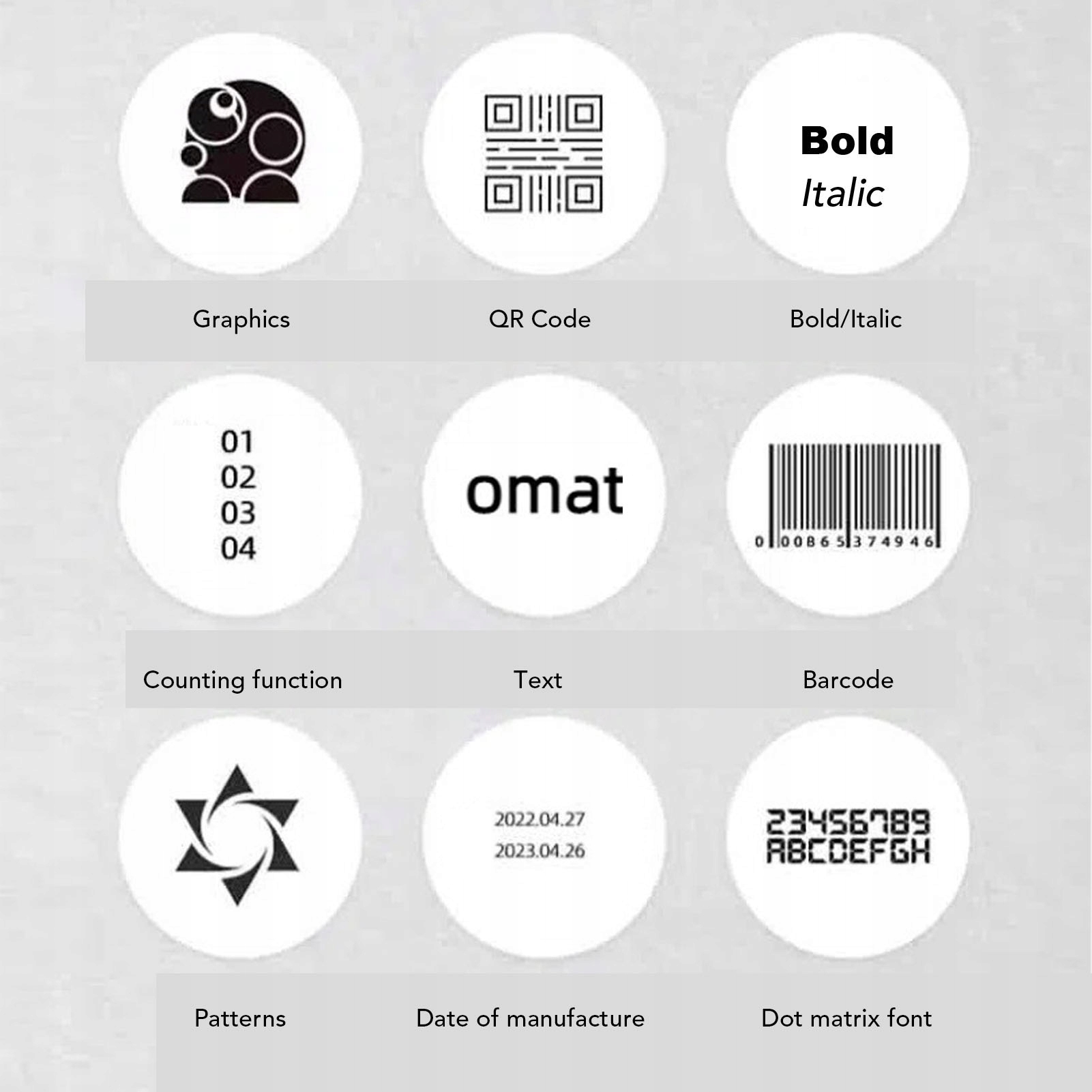 4. Можливість друку: цей портативний портативний принтер перевантаженості різні потреби друку, включаючи текст, цифри, символи, QR -коди, штрих -коди, зображення, час, дату, мітки та багато інших.