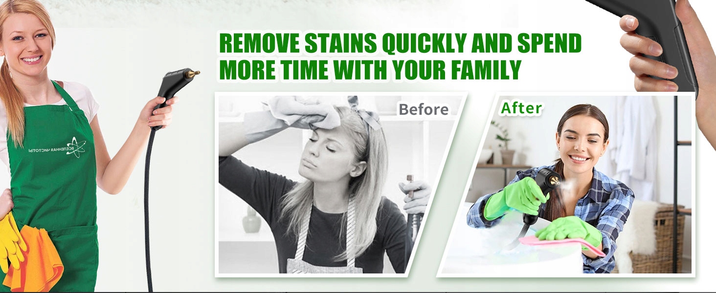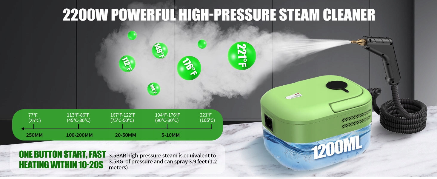 🧹 Пароочисник потужністю 2200 Вт: цей професійний пароочисник має високу потужність 2200 Вт, генеруючи високу температуру 105 °C/229 °F і пару під тиском 3 БАР лише за 15 секунд. Забезпечує ретельне очищення, ефективно видаляючи стійкі забруднення, жир і плями. Ідеально підходить для глибокого чищення без хімікатів, чудово працює на диванах та інших поверхнях.