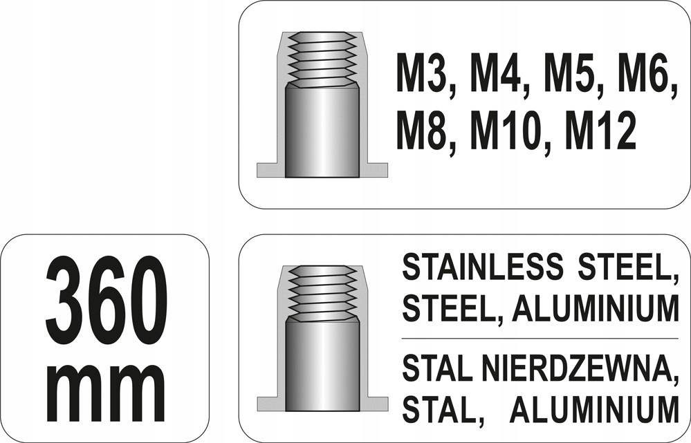 - Діаметр заклепкової гайки [мм]: M3,M4,M5,M6,M8,M10,M12