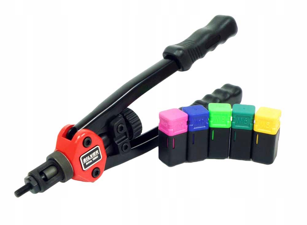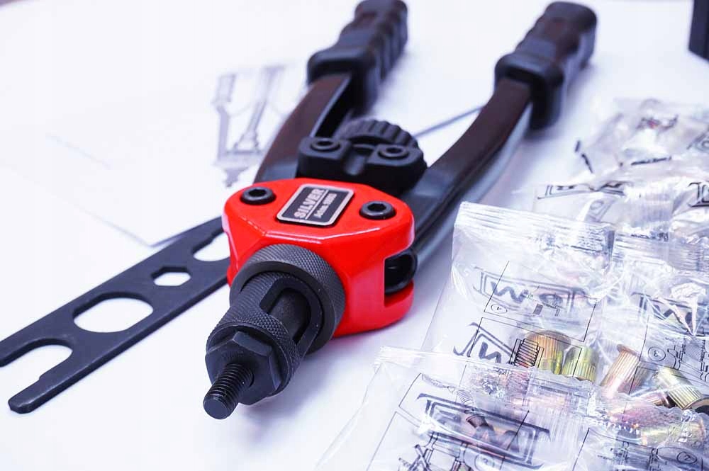 Професійний заклепувальник, призначений для з’єднання різних типів матеріалів за допомогою заклепувальних гайок. Заклепочник виготовлений з матеріалів найвищої якості. Оснащений набором з п'яти головок розмірів: M5, M6, M8, M10, M12. Застосування заклепувальних гайок дозволяє загвинчувати додаткові елементи за допомогою гвинта за розміром заклепкової гайки.