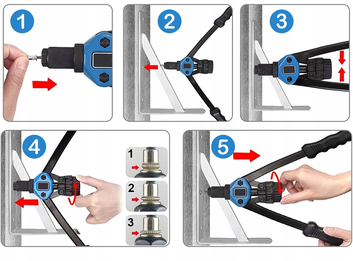 - 5️⃣ Відкрутіть стрижень, щоб розвантажити заклепувальний пістолет