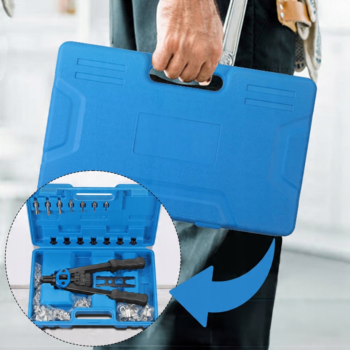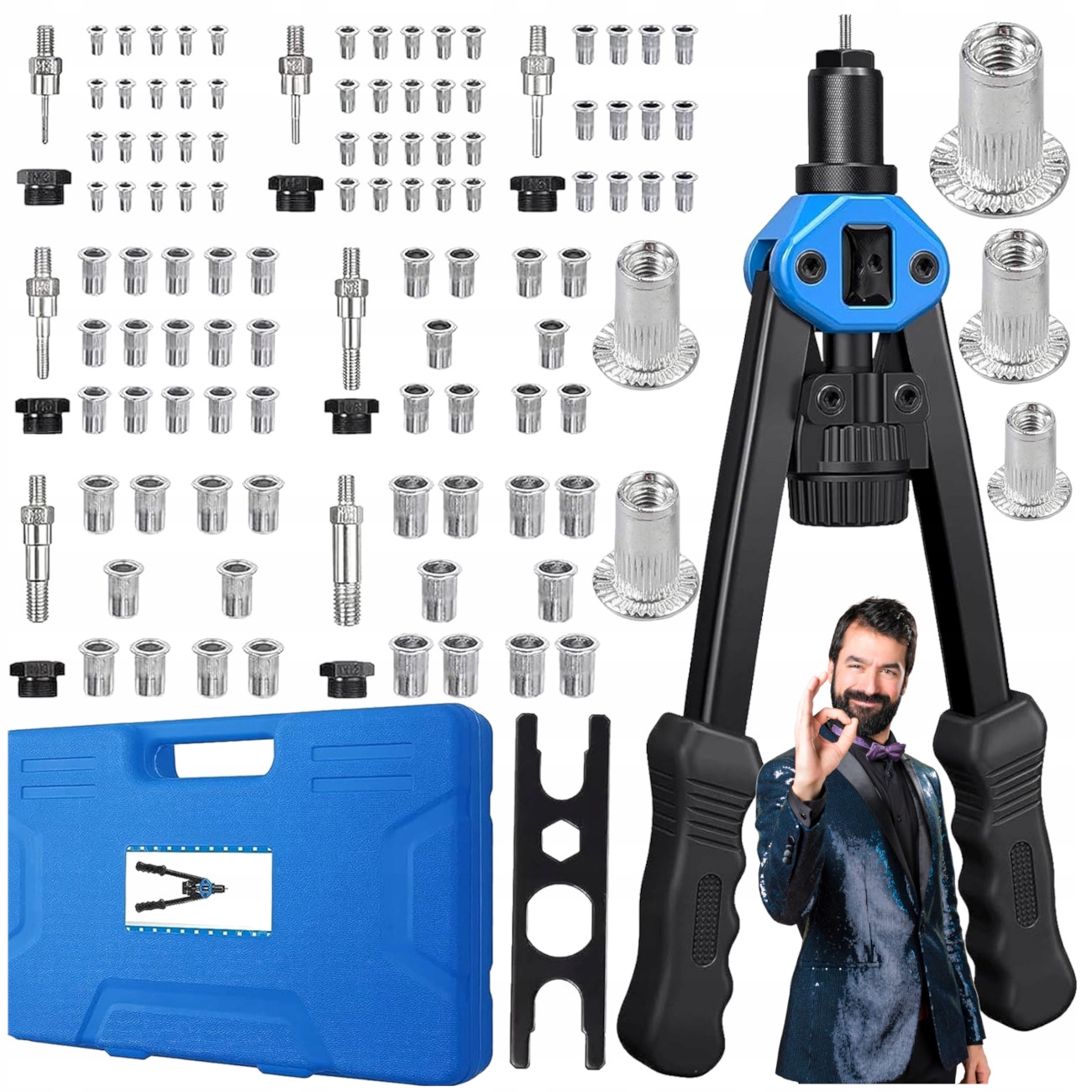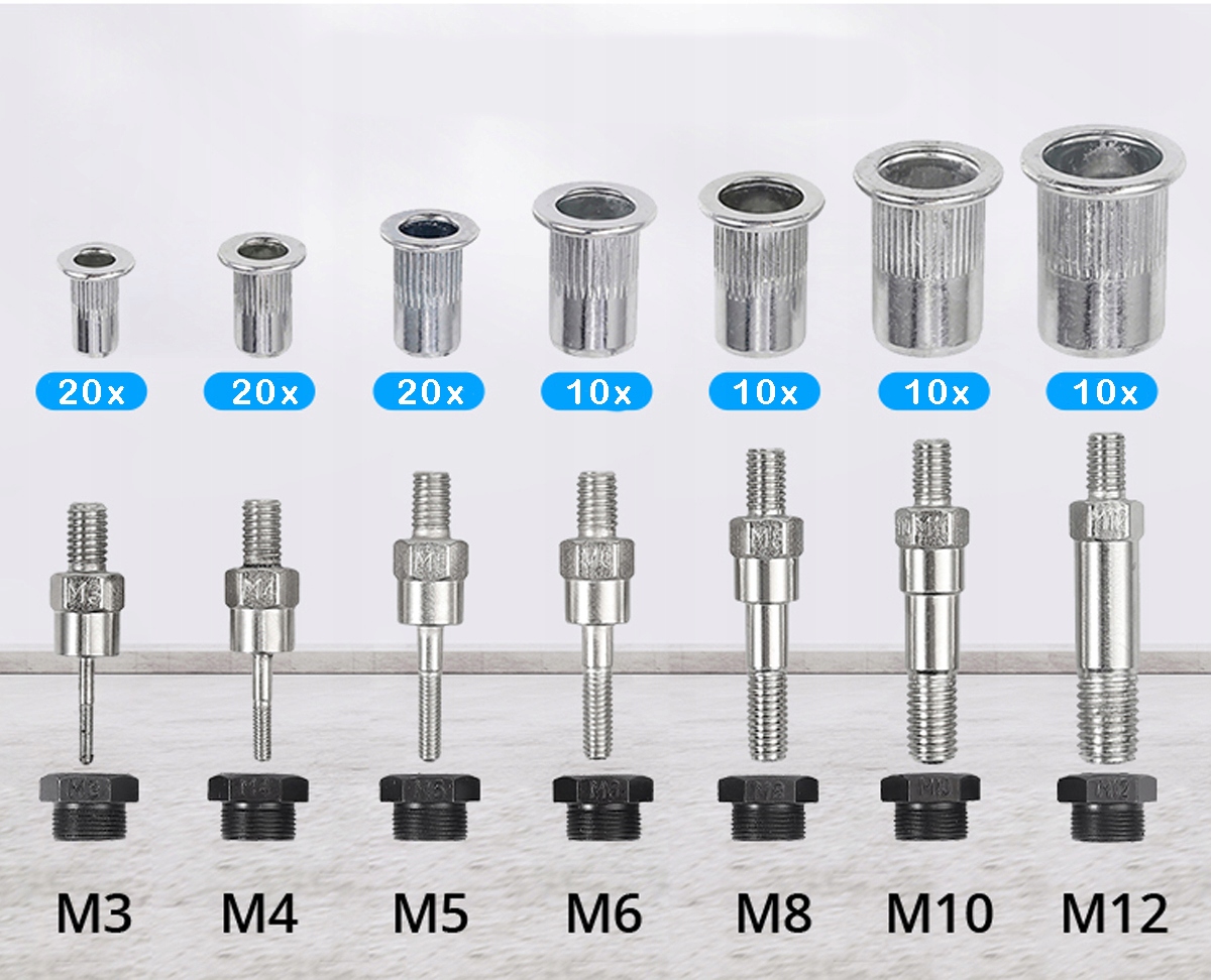 ➡️ 110 шт заклепувальних гайок від M3 до M12 ➡️ ключ для заміни оправки ➡️ оправки ➡️ головки оправки