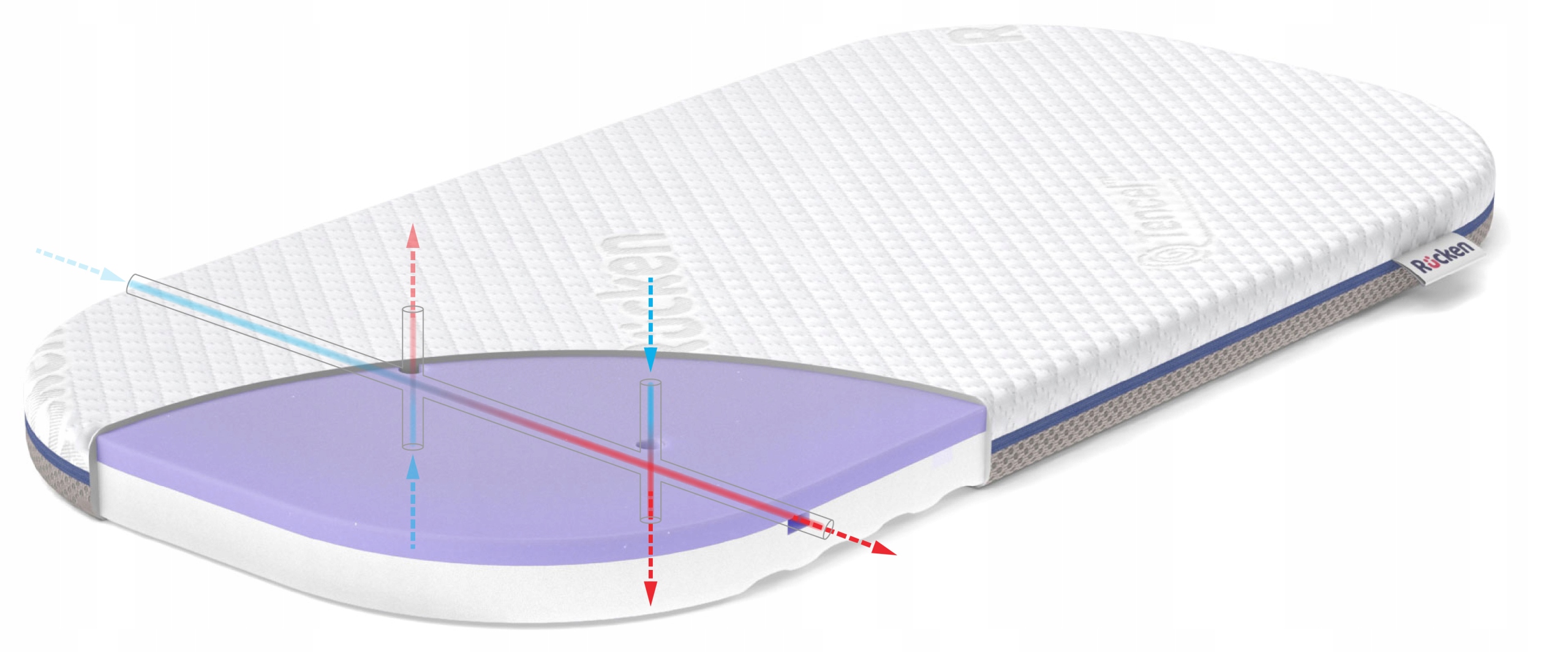 • Вентиляційні канали, розташовані на поверхні сну (біла піна), об’єднані з вертикальними каналами, що проходять через товщину матраца, і каналами, вирізаними всередині вставки. Ця структура дозволяє вільний потік повітря також у матрац дитини через 3D аераційну сітку, вшиту в усю поверхню сну