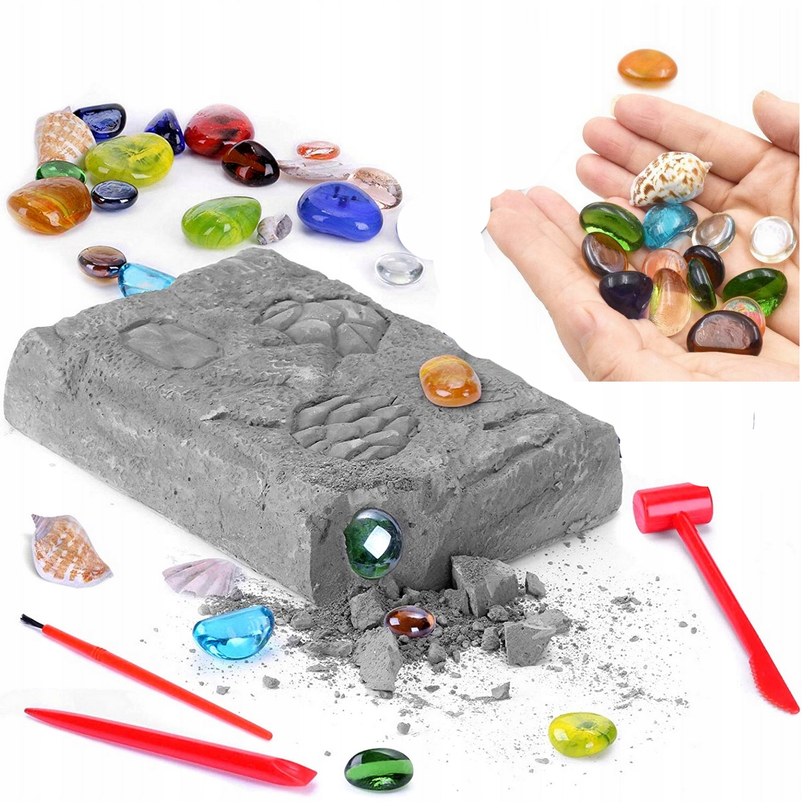 У набір входить грудок розміром 17x11x3,5 см, в якому заховані різноманітні діаманти та кристали для викопування.