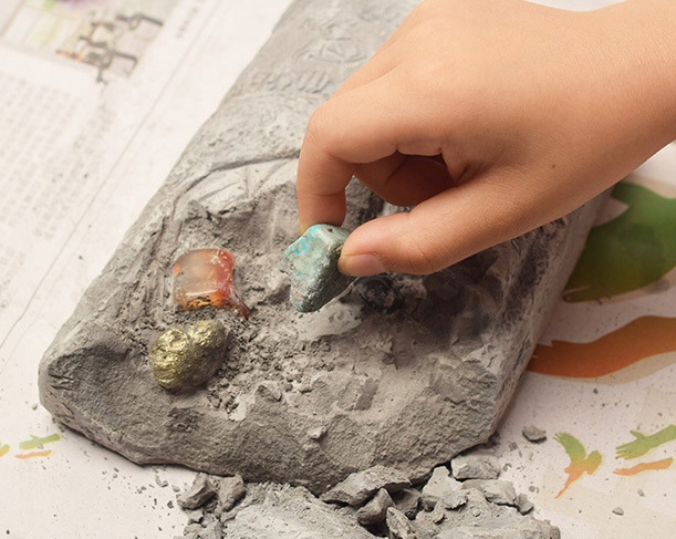 Діти використовують інструменти, що входять до набору, наприклад молоток і зубило, щоб витягувати кристали з каменю. Вони також можуть досліджувати різні шари блоку, відкриваючи нові кристали на різних глибинах!