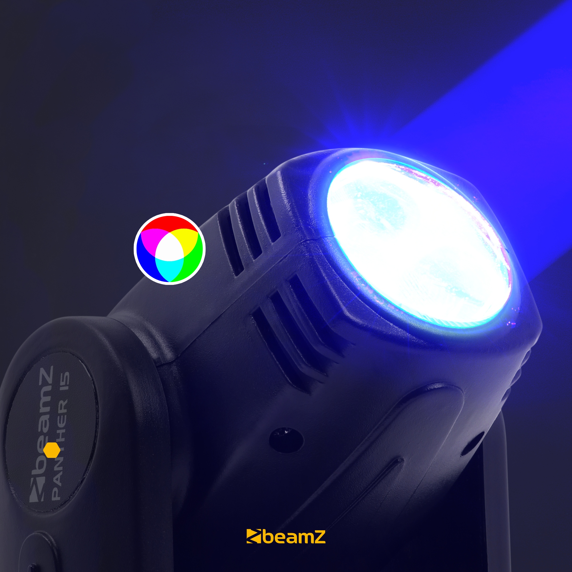 Рухома головка оснащена потужним і яскравим світлодіодом 4-в-1 потужністю 10 Вт, що забезпечує дуже високу світловіддачу. Завдяки технології 4-в-1 можна створювати кілька кольорів, а оскільки світлодіод також оснащений білим, можна використовувати пастельні кольори. Завдяки своїм компактним розмірам Panther 15 легко носити, що робить його ідеальним вибором, наприклад, для діджеїв.