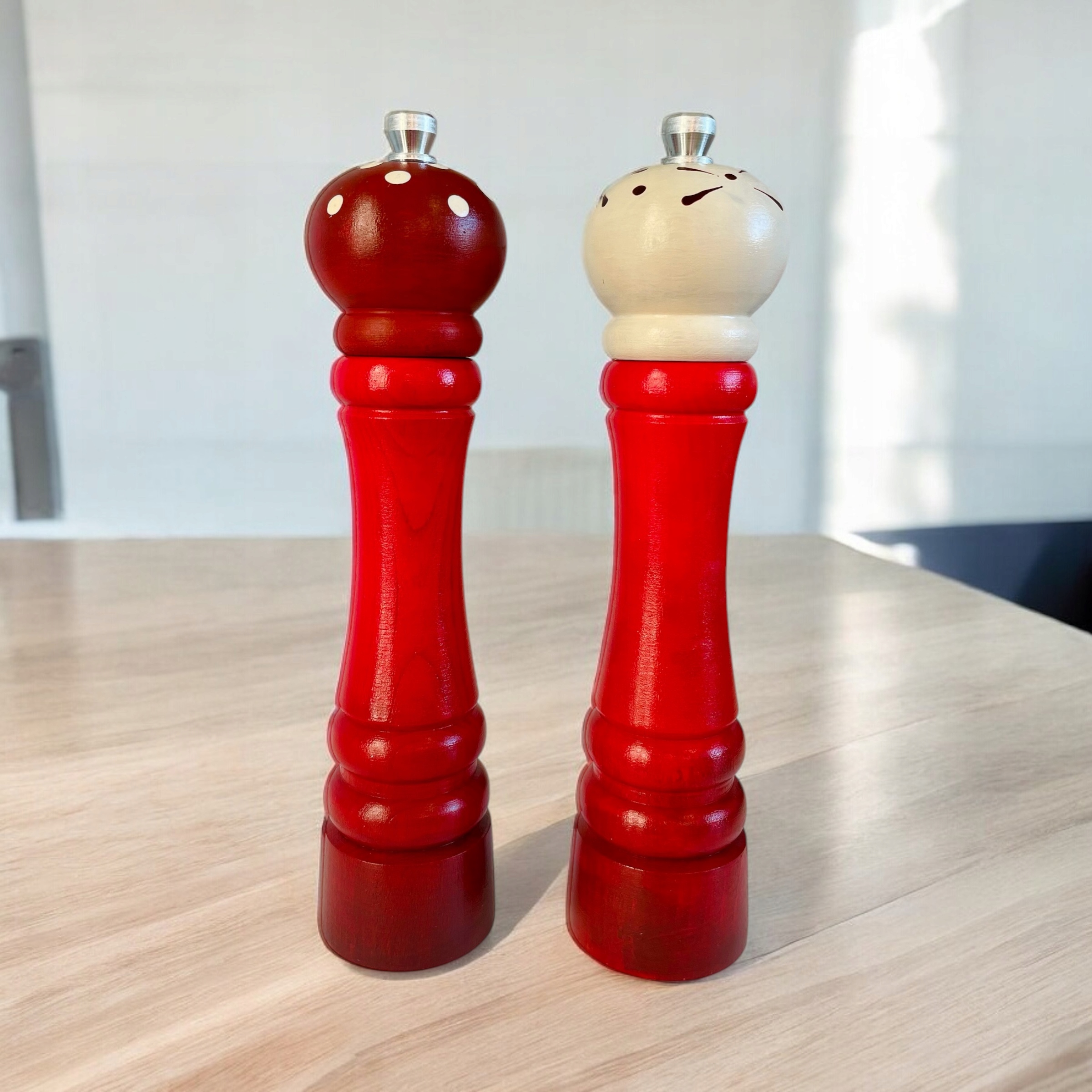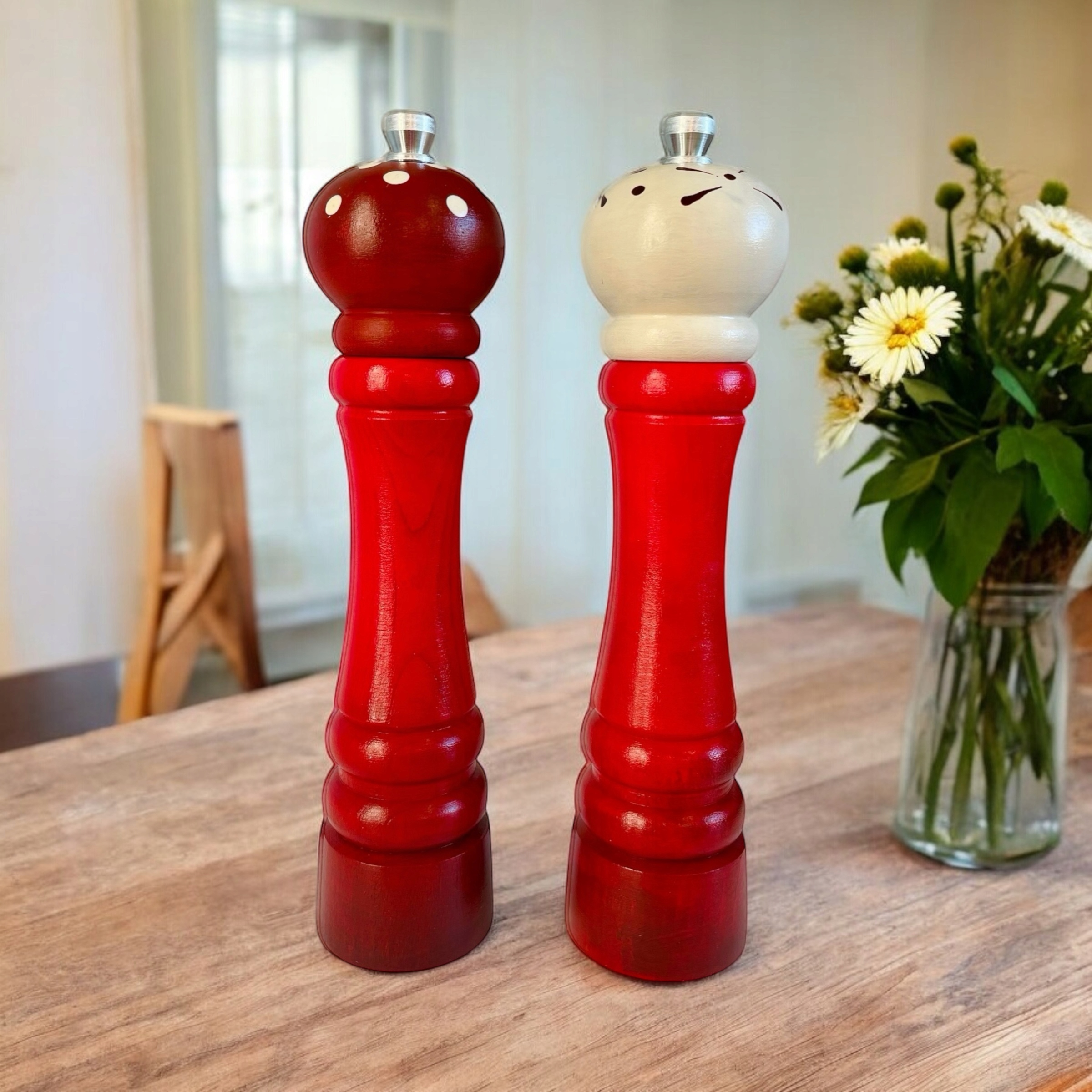 -вкладений набір сіл і перцевих млинів у відтінках червоного кольору. Виготовлений з міцного букового дерева, з точним керамічним механізмом. Створено в студії мистецтво - Kania .