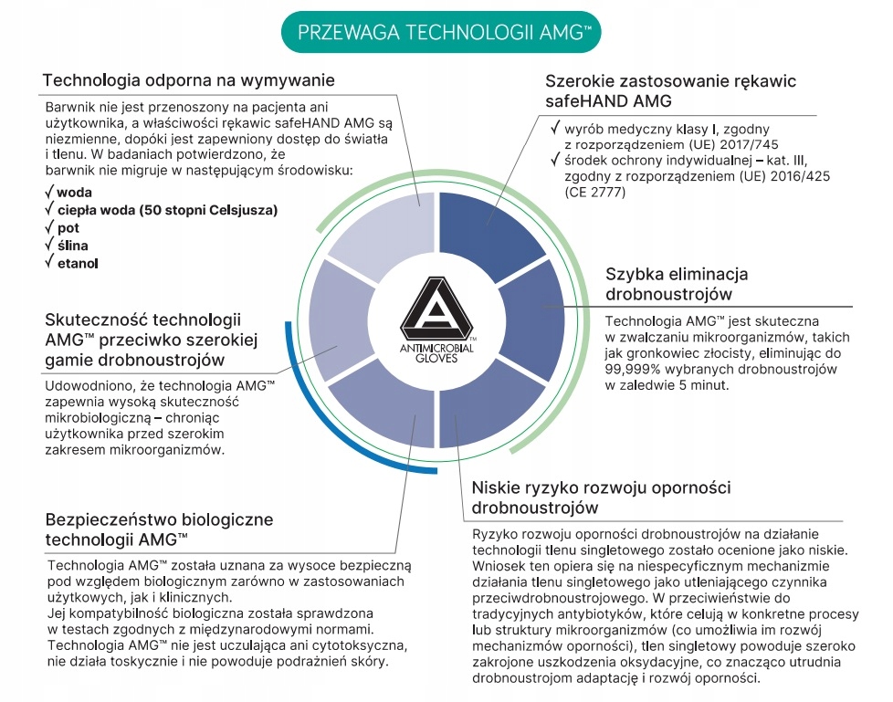 Антимікробні діагностичні та захисні нітрилові рукавички є проривним рішенням у профілактиці інфекцій, пов’язаних із наданням медичної допомоги. На відміну від традиційних медичних рукавичок, які є лише пасивним бар’єром між мікроорганізмами та шкірою рук. Технологія AMG знижує ризик мікробної передачі та перехресної інфекції завдяки своєму механізму елімінації. Рукавички призначені для швидкого знищення мікроорганізмів на зовнішній поверхні.