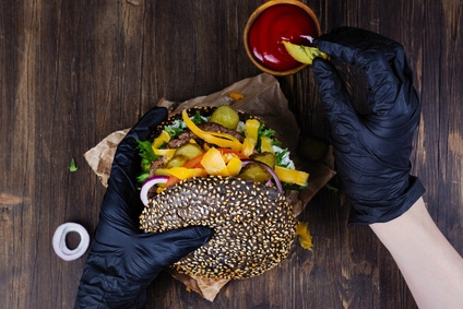 У той час як блакитні одноразові рукавички використовуються в харчовій промисловості, чорні нітрилові рукавички особливо популярні в громадському харчуванні.