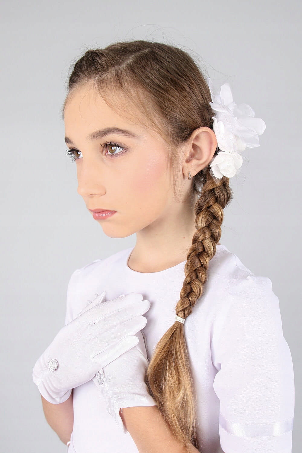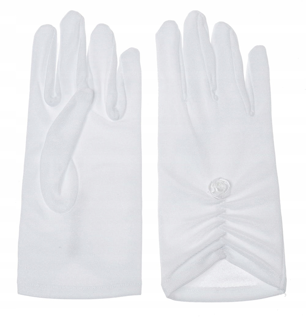 Рукавички для причастя на п'ять пальців з гладкого еластичного атласу. Прикрашена ніжною білою трояндою. Завдяки своєму елегантному зовнішньому вигляду, вони стануть прикрасою будь-якої сукні чи альбому.