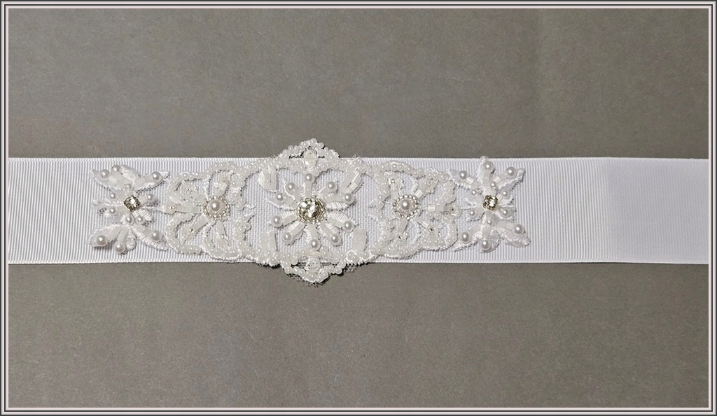 Білий пов'язаний пояс зі стрічки grosgrain, шириною 4 см і довжиною приблизно 200 см. Прикрашена мереживною аплікацією, рясно розшитою бісером