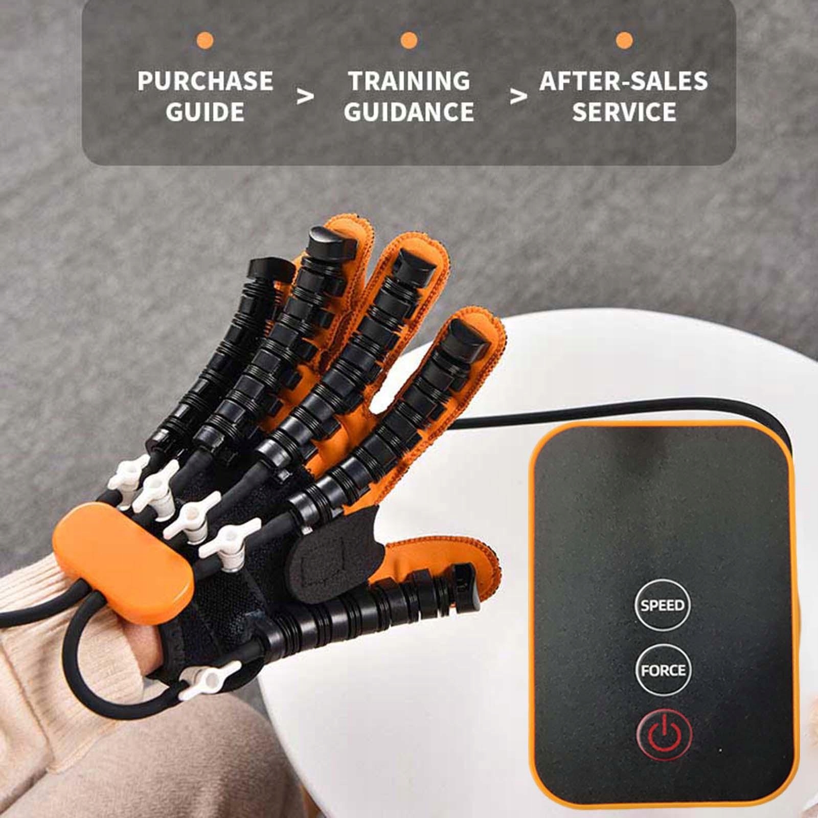 Навчання функцій рук: ортез для пальців, для поєднання реабілітаційних рукавичок і їх можна легко використовувати для захоплення предметів, такі, як навчальні м'ячі. У той же час він має інтелектуальну функцію регулювання згинання та розширення.